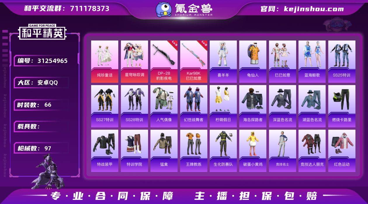 安卓 手Q-2粉装-2特效枪-0载具-0粉色飞行器-24731热力值-3王牌印记-66套装-97枪皮 【热门品类】:套装-龟仙人 【粉色套装】:粉装-纯珍童话,粉装-星穹咏叹调 【粉色枪皮等级】:Kar98K-巳巳如意(五级),DP-28-豹影疾电(五级) 【粉色枪皮】:Kar98K-巳巳如意,DP-28-豹影疾电 【粉色降落伞】:荧海星豚降落伞,炫彩糖果降落伞,罪夜之冕降落伞 【稀有套装】:套装-龟仙人,套装-巳巳如意,套装-雪国风尚,套装-蓝海鲸歌,玩偶服-喜羊羊,角色-霜刃之御 【稀有枪皮】:AKM-彩虹符号,AKM-龙的传人,M16A4-幻世战舞者,SCAR-L-炫彩节奏,SCAR-L-红色方程式,M416-糯团青竹,M416-蓝色火焰,GROZA-田园牧歌,GROZA-荧海星豚,AUG-天降萌叽,AUG-耀粉歌者,M762-天降萌叽,M762-彩虹符号,M762-登顶巅峰,Mk47-妙红点点,AC-VAL-天降萌叽,蜜獾-天降萌叽,UZI-天降萌叽,UZI-红色方程式,UMP45-涂山之恋,UMP45-生命誓言,UMP45-蓝色火焰,Vector-生命誓言,Vector-田园牧歌,Vector-音爆索尼克,汤姆逊-天降萌叽,汤姆逊-暗夜鎏金,汤姆逊-炫彩节奏,汤姆逊-耀粉歌者,P90-巳巳如意,Kar98K-红色方程式,VSS-田园牧歌,Mini14-炫彩节奏,SLR-彩虹符号,AMR-妙红点点,AMR-喜羊羊与灰太狼,S686-彩虹符号,S686-生命誓言,S1897-暗夜鎏金,S12K-玩趣呆呆,S12K-极意拳锋,SPAS-12-田园牧歌,M249-妙红点点,M249-彩虹符号,M249-糯团青竹,DP-28-彩虹符号,MG3-妙红点点,MG3-幻世战舞者 【其他套装】:套装-SS25特训,套装-SS27特训,套装-SS28特训,套装-人气偶像,套装-幻世战舞者,套装-柠萌假日,套装-海岛探路者,套装-深蓝色名流,套装-湖蓝色名流,套装-燃烧卡路里,套装-特战装甲,套装-特训学院,套装-猛禽,套装-王牌教练,套装-生化防暴队,套装-破蛋小黄鸡,套装-竞技名士,套装-竞技达人朋克,套装-红色...