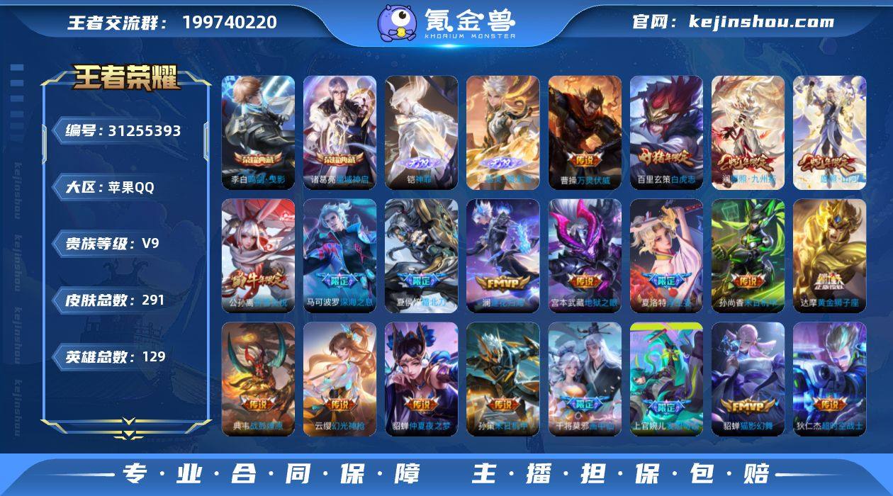 不可二次 苹果Q-V9-最强王者段位-129英雄-291皮肤-2典藏皮肤-1典藏英雄-2无双-25传说-88史诗 【英雄全皮】:影全皮 【荣耀典藏】:武则天英雄,李白鸣剑曳影,诸葛亮星域神启 【无双皮肤】:曜器灵螭龙剑,铠神罪 【传说皮肤】:杨戬纵目迁山,后羿神树通天,曹操万灵伏威,司空震愿照山河定,澜愿照九州拓,云缨幻光神枪,夏侯惇霜北刀,典韦战鼓燎原,澜逐花归海,上官婉儿妄想奇谈,夏洛特浮生妄,干将莫邪画中仙,马可波罗深海之息,孙策末日机甲,公孙离祈雪灵祝,虞姬启明星使,貂蝉猫影幻舞,达摩黄金狮子座,百里玄策白虎志,貂蝉仲夏夜之梦,孙尚香末日机甲,宫本武藏地狱之眼,孙悟空地狱火,武则天海洋之心,狄仁杰超时空战士 【限定皮肤】:白起狰,夏侯惇霜北刀,姜子牙天穹之誓,狄仁杰阴阳师,赵云皇家上将,赵云引擎之心,鲁班七号狮舞东方,阿轲迷踪丽影,芈月重明,吕布御风骁将,夏侯惇朔风刀,曹操烛龙,典韦穷奇,马可波罗暗影游猎,马可波罗深海之息,狄仁杰魔术师,狄仁杰万华元夜,达摩沙漠行僧,项羽海滩派对,老夫子醍醐杖,貂蝉逐梦之音,程咬金演武夺筹,刘邦夺宝奇兵,韩信逐梦之影,韩信飞衡,韩信傲雪梅枪,兰陵王金庭之子,牛魔御旌,后羿如梦令,刘备百相守梦,李元芳云中旅人,虞姬启明星使,钟馗神迹守卫,哪吒逐梦之翼,干将莫邪画中仙,雅典娜黎明之约,蔡文姬繁星吟游,太乙真人饕餮,太乙真人华丽摇滚,鬼谷子原初探秘者,鬼谷子五谷丰年,苏烈千军破阵,百里玄策白虎志,百里玄策原初追逐者,弈星混沌棋,梦奇顽趣,公孙离祈雪灵祝,沈梦溪大漠名商,明世隐疑决卦,裴擒虎天狼狩猎者,裴擒虎李小龙,裴擒虎擒涛扼浪,狂铁御狮,米莱狄御霄,云中君纤云弄巧,盾山御銮,猪八戒西部大镖客,上官婉儿妄想奇谈,嫦娥如梦令,嫦娥暖冬兔眠,桑启海盐诗旅,夏洛特浮生妄,暃星...