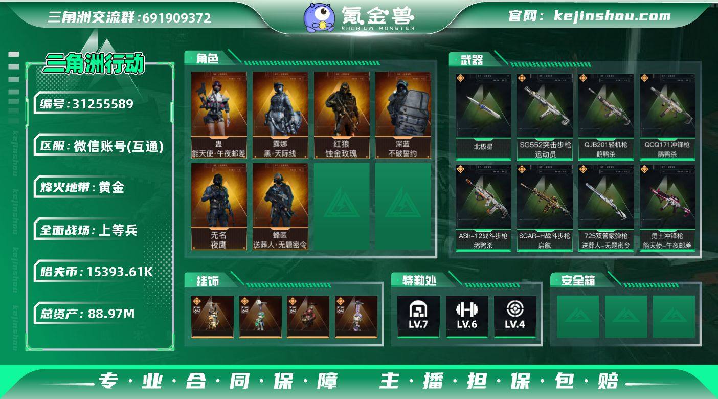实名:可二次实名 总资产:88.97M 哈夫币:15393.61K 烽火地带段位:黄金 烽火地带等级:60 全面战场段位:上等兵 全面战场等级:26 7级仓库,6级训练中心,4级靶场,1级潜水中心,1级收藏室
