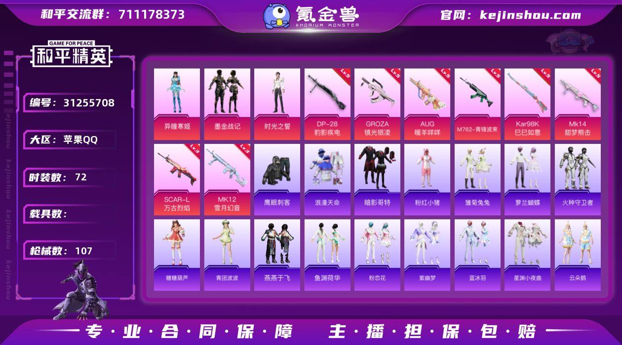 苹果 手Q-3粉装-8特效枪-0载具-2粉色飞行器-31074热力值-4王牌印记-72套装-107枪皮 【热门品类】:套装-浪漫天命,套装-暗影哥特,套装-粉红小猪 【粉色套装】:粉装-墨金战记,角色-时光之誓,角色-异瞳寒姬 【粉色枪皮等级】:SCAR-L-万古烈焰(三级),GROZA-镜光银凌(五级),AUG-暖羊咩咩(五级),M762-青锋波束(五级),Kar98K-巳巳如意(五级),Mk14-甜梦熊击(五级),MK12-雪月幻音(三级),DP-28-豹影疾电(五级) 【粉色枪皮】:SCAR-L-万古烈焰,GROZA-镜光银凌,AUG-暖羊咩咩,M762-青锋波束,Kar98K-巳巳如意,Mk14-甜梦熊击,MK12-雪月幻音,DP-28-豹影疾电 【粉色飞行器】:动力核心飞行器 【粉色降落伞】:忍者神龟降落伞,BEARBRICK降落伞,月影灵韵降落伞,彩虹独角兽降落伞,月下星之子降落伞,绯果甜心降落伞,星穹咏叹调降落伞,幻星舰长降落伞,炫彩糖果降落伞 【稀有套装】:套装-炫彩糖果,套装-雏菊兔兔,套装-萝兰蝴蝶,套装-火种守卫者,套装-糖糖葫芦,套装-青团波波,套装-燕燕于飞,套装-鱼渊荷华,套装-粉恋花,套装-紫幽梦,套装-蓝冰羽,套装-星渊小夜曲,套装-云朵鹅,套装-雪绒豹,角色-灵公主 【稀有枪皮】:SCAR-L-夜灯,SCAR-L-炫彩节奏,M416-红色方程式,AUG-幻影战神,AUG-耀粉歌者,QBZ-魔药课室,M762-天降萌叽,M762-云朵鹅,蜜獾-青瓷战姬,Famas-桃粉嫣然,UMP45-夜灯,汤姆逊-天降萌叽,汤姆逊-炫彩节奏,P90-巳巳如意,SKS-炫彩节奏,SKS-棋盘冕主,SVD-云朵鹅,S12K-玩趣呆呆,S12K-夜灯,S12K-智耀战神,S12K-极意拳锋,DBS-彩虹符号,DBS-荧海星豚,SPAS-12-云朵鹅,M249-糯团青竹,DP-28-彩虹独角兽,MG3-幻世战舞者,R1895-镭金极速,短管霰弹-星穹咏叹调,沙漠之鹰-云朵鹅,大砍刀-万古烈焰,大砍刀-云朵鹅 【其他套装】:套装-TT战队服,套装-冷焰舞者,套装-旭日情...