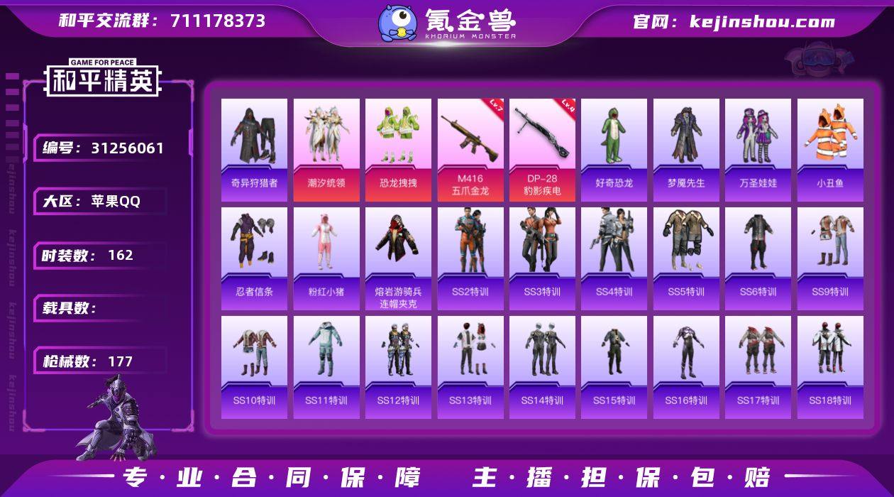 苹果 手Q-2粉装-2特效枪-0载具-50592热力值-5印记-162套装-177枪皮 【热门品类】:套装-小丑鱼,套装-奇异狩猎者,套装-忍者信条,旭日初心兜帽大衣,套装-粉红小猪,小恶魔头饰,熔岩游骑兵面罩,熔岩游骑兵连帽夹克 【粉色套装】:粉装-潮汐统领,粉装-恐龙拽拽 【粉色枪皮等级】:M416-五爪金龙(七级M416-五爪金龙),DP-28-豹影疾电(四级DP-28-豹影疾电) 【粉色枪皮】:M416-五爪金龙,DP-28-豹影疾电 【粉色降落伞】:齐天大圣降落伞 【稀有枪皮】:AKM-冰凉西瓜,AKM-夜灯,AKM-灼热熔岩,AKM-玉龙,AKM-生命誓言,AKM-破晓战魂,AKM-萌趣颜团子,AKM-虎虎生威,M16A4-夜灯,M16A4-机械英豪,M16A4-生命誓言,M16A4-红色方程式,SCAR-L-夜灯,SCAR-L-炫彩节奏,SCAR-L-生命誓言,SCAR-L-雷霆特警,SCAR-L-黄金龙骨,M416-夜灯,M416-绯红前夜,M416-蓝色火焰,M416-魔法学院,M416-黄金龙骨,GROZA-彩虹符号,GROZA-治愈之星,GROZA-生命誓言,GROZA-雷霆特警,AUG-凝视深渊,AUG-青春冒险家,QBZ-原初圣火,QBZ-彩虹符号,QBZ-洛神天依,QBZ-诡娃娃,QBZ-赛罗,QBZ-飞驰魅影,M762-牛气冲天,M762-瑞龙福将,M762-生命誓言,M762-绯红前夜,M762-诡娃娃,M762-镭射皇者,Mk47-百万伏特,Mk47-青春冒险家,G36C-不夜海上花,G36C-时空追击者,G36C-暗夜玫瑰,UZI-古堡领主,UZI-幻影战神,UZI-影袭,UZI-炫彩节奏,UZI-生命誓言,UZI-金玉无双,UMP45-夜灯,UMP45-时空追击者,UMP45-生命誓言,UMP45-粉色回忆,UMP45-荒野猎神,UMP45-诡娃娃,Vector-夜灯,Vector-彩虹符号,Vector-暗夜玫瑰,Vector-治愈之星,Vector-生命誓言,Vector-金玉无双,汤姆逊-天降萌叽,汤姆逊-奇异狩猎者,汤姆逊-耀粉歌者,野牛-夜灯,野牛-机械英豪,野牛-王牌四分卫,野牛-青春冒险家,P90-飞驰魅影,Kar98K-古堡领主,Kar9...