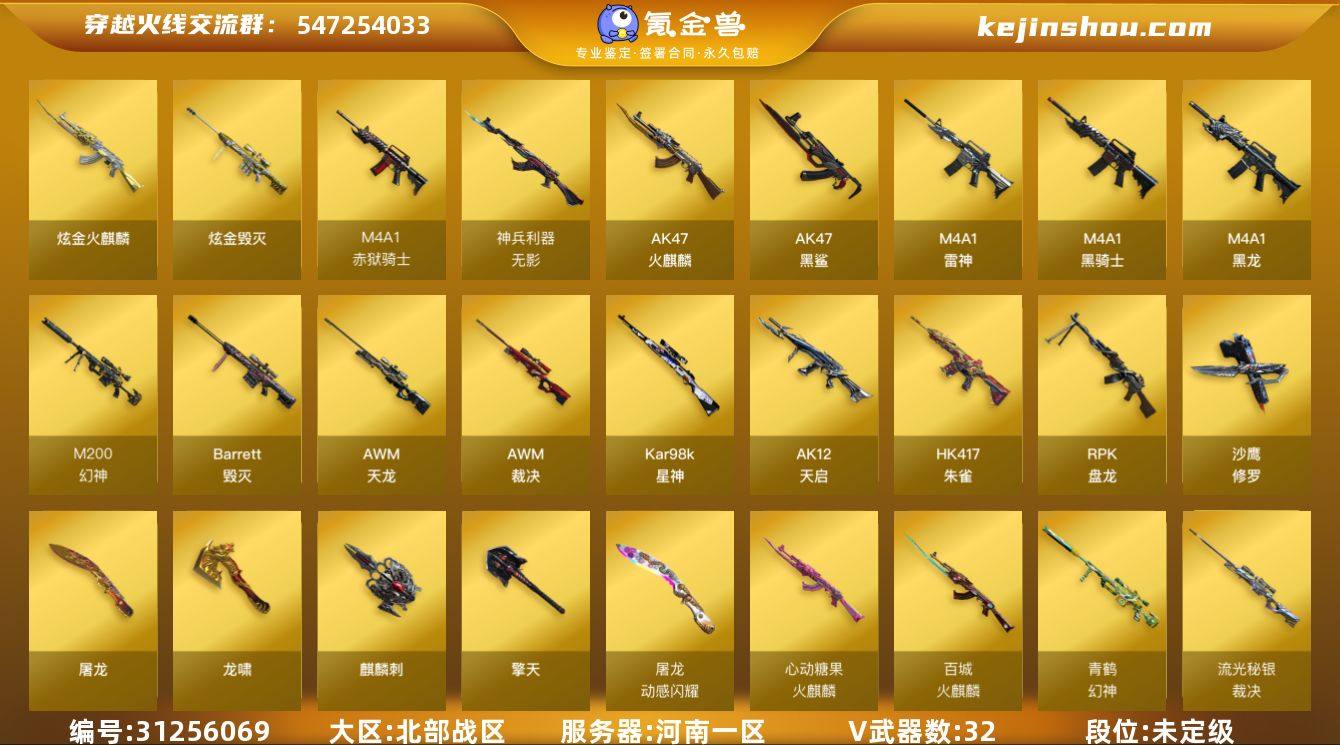 河南一区-33V-2王者-2炫金 【热门武器】:HK417-朱雀,M200-幻神,Kar98K-星神,M4A1-黑骑士*2,RPK-盘龙,幻神-枪娘爱丽丝,沙鹰-修罗,黄金猫猫手套-白鲨 【王者炫金武器】:炫金火麒麟,炫金毁灭 【音效卡】:AK47-火麒麟音效卡,M4A1-雷神音效卡,M4A1-黑骑士音效卡,Barrett-毁灭音效卡 【皮肤】:幻神-青鹤,幻神-电流骇客 皮肤,幻神-荣耀世冠白鲨2023 皮肤,裁决-流光秘银,星神-枪娘默 皮肤,火麒麟-百城,火麒麟-心动糖果,毁灭耀金皮肤,毁灭-风暴 【角色】:关小雨,王者沙漠玫瑰,暗夜-X,芳心审判者,嘉年华灵狐,娟娟,兰-海滩派对,零-水下丽影,灵狐者-X,灵狐者-七夕宝贝,女主播,潘多拉-X,潘多拉-甜心教官,斯沃特-X,蜀雪,影武者-X 【人偶武器】:幻神-枪娘爱丽丝,AWM-灵狐-15周年嘉年华,M4A1-斯沃特 【挑战大师】:冰龙粉碎者-白马银枪,阐释者III 【英雄级武器】:AK47-火麒麟*2,M4A1-黑龙*2,M4A1-雷神*2,M4A1-黑骑士*2,AK12-天启,AK47-黑鲨,HK417-朱雀,无影-神兵利器,AWM-天龙,Barrett-毁灭,AWM-裁决,M200-幻神,Kar98K-星神,RPK-盘龙,沙鹰-修罗,屠龙,龙啸,擎天,麒麟刺*2,王者之锋-觉醒版*2,高爆手雷-竞技荣光*3,闪光弹-竞技荣光,烟雾弹-竞技荣光*3,M4A1-赤狱骑士 【道具】:神秘礼盒背包,BS战队炫彩背包,全能枪王背包,冰冰企鹅背包-猛男专用,炫彩背包,背包-葫芦兄弟,女皇终结者-魔龙之吻,绿色巨人,灵魂忍者,迷雾幽灵,夺命之镰,防化服*3,金色流光-枪王排位,枪王排位29赛季金色流光,防弹头盔*4,防弹衣*4,C4工具钳*3,手雷包*3 【特殊枪械】:2黑骑士,1盘龙