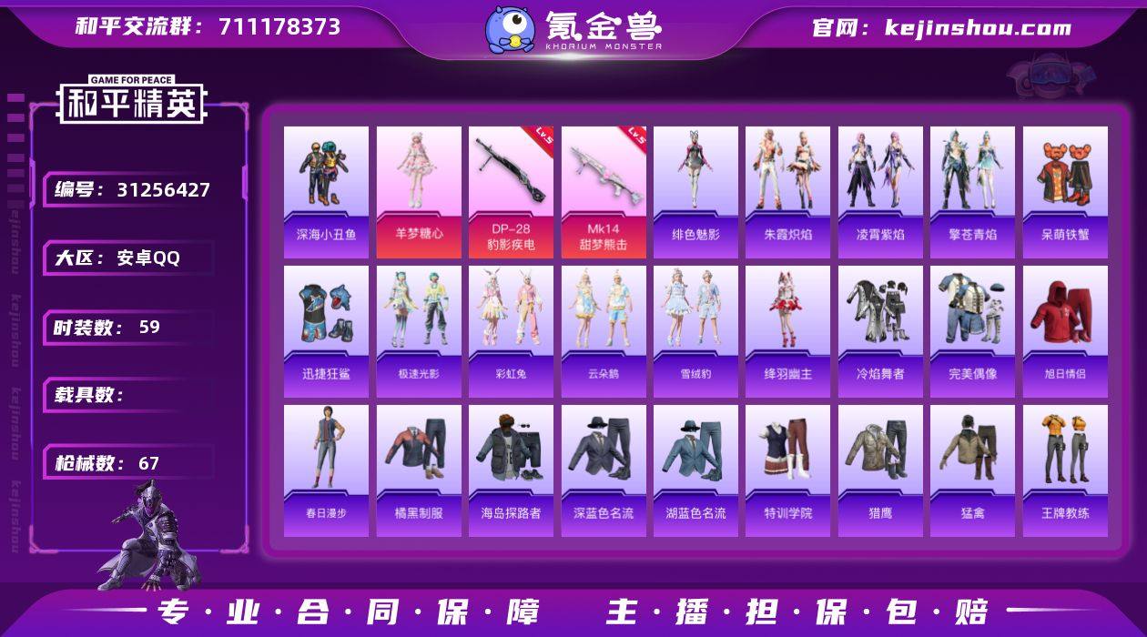 【AZH2634】安卓 手Q【羊梦糖心 深海小丑鱼】1粉装-2特效枪-0载具-1粉色飞行器-17996热力值-3王牌印记-59套装-67枪皮 【热门品类】:套装-深海小丑鱼 【粉色套装】:角色-羊梦糖心 【粉色枪皮等级】:Mk14-甜梦熊击(五级),DP-28-豹影疾电(五级) 【粉色枪皮】:Mk14-甜梦熊击,DP-28-豹影疾电 【粉色降落伞】:异瞳寒姬降落伞,极意拳锋降落伞,炫彩糖果降落伞 【稀有套装】:套装-炫彩糖果,套装-极速光影,套装-彩虹兔,套装-云朵鹅,套装-雪绒豹,角色-绛羽幽主,套装-朱霞炽焰,套装-凌霄紫焰,套装-擎苍青焰,角色-绯色魅影 【稀有枪皮】:SCAR-L-冷漠罗丽,M416-蓝色火焰,GROZA-影袭,M762-云朵鹅,AC-VAL-天降萌叽,ARX-凌霄紫焰,UMP45-极意拳锋,JS9-凌霄紫焰,M24-影袭,SVD-云朵鹅,S686-生命誓言,S1897-荧海星豚,S12K-夜灯,DBS-彩虹符号,SPAS-12-云朵鹅,M249-糯团青竹,MG3-幻世战舞者,MG-36-凌霄紫焰,P92-凌霄紫焰,沙漠之鹰-云朵鹅,大砍刀-云朵鹅,平底锅-凌霄紫焰 【其他套装】:套装-冷焰舞者,套装-完美偶像,套装-旭日情侣,套装-春日漫步,套装-橘黑制服,套装-海岛探路者,套装-深蓝色名流,套装-湖蓝色名流,套装-特训学院,套装-猎鹰,套装-猛禽,套装-王牌教练,套装-生化防暴队,套装-白色伏地魔,套装-竞技名士,套装-红色运动,套装-绮丽涂鸦,套装-缤纷果语,套装-蓝彩潮人,套装-蓝色运动,套装-酒红色名流,套装-长空猛禽,套装-魅力单车,套装-黄色伏地魔,套装-黄色名流,套装-黄色运动,套装-黑色伏地魔,套装-深海小丑鱼,套装-呆萌铁蟹,套装-迅捷狂鲨,套装-弄潮海豚 【稀有头盔】:深海小丑鱼头盔(2级) 【稀有背包】:深海小丑鱼背包(2级) 【营地ID】:1039466452