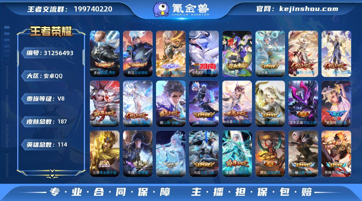 【李白韩信典藏,曜无双,基德孙策2珍品,澜年限,雪女,v8(差1kv9),2水1无双2珍品29传说,42按键,5改名卡】贵族8 荣耀典藏2 无双1 珍品传说2 传说皮肤29 史诗皮肤66 皮肤数量187 皮肤价值:191952 英雄114 永恒钻石V 总场次2886