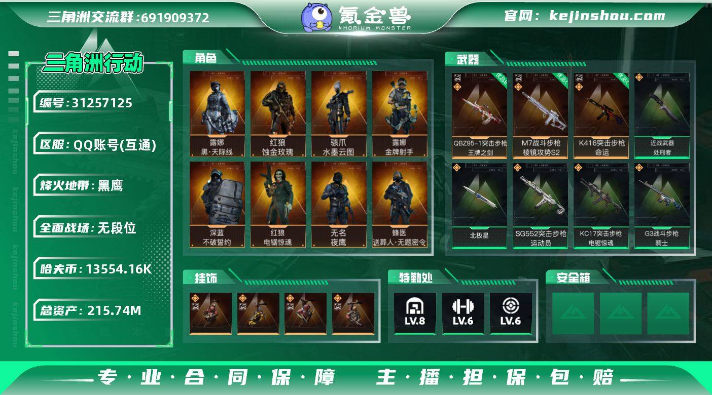 实名:可二次实名 总资产:215.74M 哈夫币:13554.16K 烽火地带段位:黑鹰 烽火地带等级:60 全面战场段位:无段位 全面战场等级:3 8级仓库,6级训练中心,6级靶场,2级潜水中心,1级收藏室