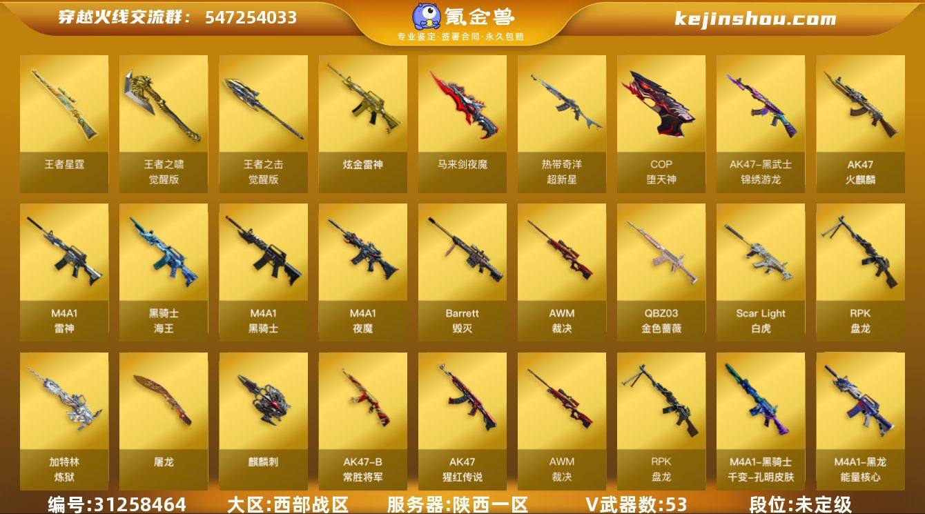 陕西一区-56V-7王者武器数-1炫金武器数 【热门武器】:QBZ03-金色蔷薇,Scar Light-白虎,柯尔特-冠军之特,M4A1-黑骑士,RPK-盘龙*2,加特林-炼狱,COP-堕天神*5 【王者炫金武器】:王者星霆,炫金雷神 【音效卡】:Barrett-毁灭音效卡 【皮肤】:雷神-荣耀之魄,雷神-源计划2.0专属 皮肤,毁灭-黑大圣皮肤,毁灭-百城浙江 皮肤,M4A1-千变-孔明皮肤,黑龙-能量核心,无影-能量核心,AK47-B-常胜将军-曹操,屠龙-荣耀之锋 【角色】:凌霄,战地猎狐,王者-葵-貂蝉,王者玲珑-小乔,奇洋探员,修道士,暗夜-X,初恋灵狐,电竞少女,芳心审判者,荆棘玫瑰,兰妹妹,0号玩家,灵狐-花神,灵狐者-X,灵狐者-黄金海岸,麻雀,潘多拉-X,潜龙队-X,铁骑荣耀,游珑儿 【人偶武器】:生化手雷-机甲核心*2,闪光弹-小乔,闪光弹-貂蝉,高爆手雷-大乔,M4A1-斯沃特,灵狐娃娃手雷 【暴走生化】:超级对讲机 【挑战大师】:冰龙粉碎者-白马银枪,激光毁灭者III-白马银枪,VEPR-12-金魔 【英雄级武器】:AK47-火麒麟,M4A1-雷神,M4A1-黑骑士,Scar Light-白虎,M4A1-夜魔,黑武士-锦绣游龙,超新星-热带奇洋,QBZ03-金色蔷薇,AK-47-猩红传说,黑骑士-海王,AK47-B-常胜将军,Barrett-毁灭,AWM-裁决,王者幻神-觉醒版,RPK-盘龙*2,加特林-炼狱,COP-堕天神*5,柯尔特-冠军之特,破空枪刃-夜魔,屠龙*2,马来剑-夜魔,麒麟刺,龙啸-热带奇洋,王者之啸-觉醒版,王者之击-觉醒版,高爆手雷-夜魔*7,手雷-热带奇洋,闪光弹-夜魔*7,闪光弹-雷霆王者-觉醒版,烟雾弹-夜魔*7,M4A1-赤狱骑士 【道具】:CFS限定背包,全能枪王背包,奇洋探员-海龟背包,热带奇洋炫彩背包,超级背包,哔哩哔哩名片,救世主-黑桃战神,绿色巨人,灵魂忍者,变异宝贝,迷雾幽灵,生化弹匣,夺命之镰,防化服,星辰流光-枪王排位,巅峰赛先锋-金色流...