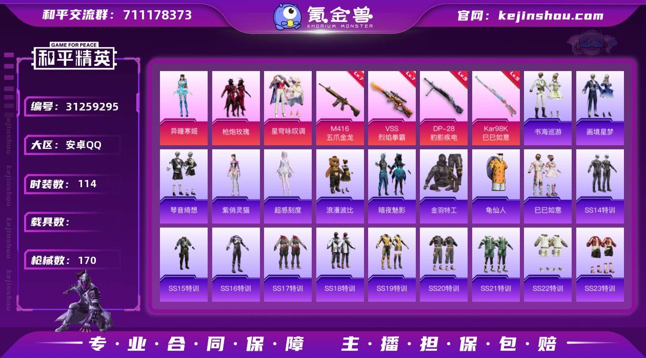 安卓 手Q-4粉装-5特效枪-0载具-2粉色飞行器-48516热力值-9王牌印记-114套装-170枪皮HZ26205014 【热门品类】:套装-金羽特工,套装-龟仙人,套装-浪漫波比 【粉色套装】:粉装-枪炮玫瑰,粉装-星穹咏叹调,角色-异瞳寒姬,角色-罪夜之冕 【粉色枪皮等级】:M416-五爪金龙(七级),AKS-74U-森灵之息(五级),Kar98K-巳巳如意(五级),VSS-烈焰拳霸(七级),DP-28-豹影疾电(五级) 【粉色枪皮】:M416-五爪金龙,AKS-74U-森灵之息,Kar98K-巳巳如意,VSS-烈焰拳霸,DP-28-豹影疾电 【粉色飞行器】:绝对恒星飞行器 【粉色降落伞】:绝对恒星降落伞,梦之光华降落伞,海渊国主降落伞,彩虹甜喵降落伞,异瞳寒姬降落伞,极意拳锋降落伞,炫彩糖果降落伞 【稀有套装】:套装-龟仙人,套装-巳巳如意,角色-超感刻度,套装-雪国风尚,套装-炫彩糖果,角色-紫俏灵猫,套装-书海巡游,套装-画境星梦,套装-琴音绮想 【稀有枪皮】:AUG-冰晶雪宝,AKM-夜灯,AKM-彩虹符号,AKM-星之彼岸,AKM-生命誓言,AKM-破晓战魂,AKM-虎虎生威,AKM-龙的传人,M16A4-幻世战舞者,M16A4-甜心亚梦,SCAR-L-炫彩节奏,SCAR-L-红色方程式,SCAR-L-黄金龙骨,M416-梨园星光,M416-糯团青竹,M416-蓝色火焰,GROZA-异彩先驱,GROZA-治愈之星,GROZA-田园牧歌,GROZA-紫翼圣骑,GROZA-荧海星豚,AUG-幻影战神,AUG-怪笑疯兔,AUG-耀粉歌者,QBZ-飞驰魅影,M762-瑞龙福将,M762-登顶巅峰,Mk47-洛神天依,G36C-时空追击者,AC-VAL-天降萌叽,AC-VAL-甜心亚梦,蜜獾-垂柳戏鸭,蜜獾-天降萌叽,蜜獾-娇憨猪猪,ACE32-画境星梦,UZI-天降萌叽,UZI-娇憨猪猪,UZI-炫彩节奏,UMP45-时空追击者,UMP45-灵符少年,UMP45-蓝色火焰,Vector-治愈之星,Vector-生命誓言,Vector-田园牧歌,汤姆逊-异彩先驱,MP5K-异彩先驱,MP5K-蓝莓炮弹,MP5K-画境星梦,P90-...