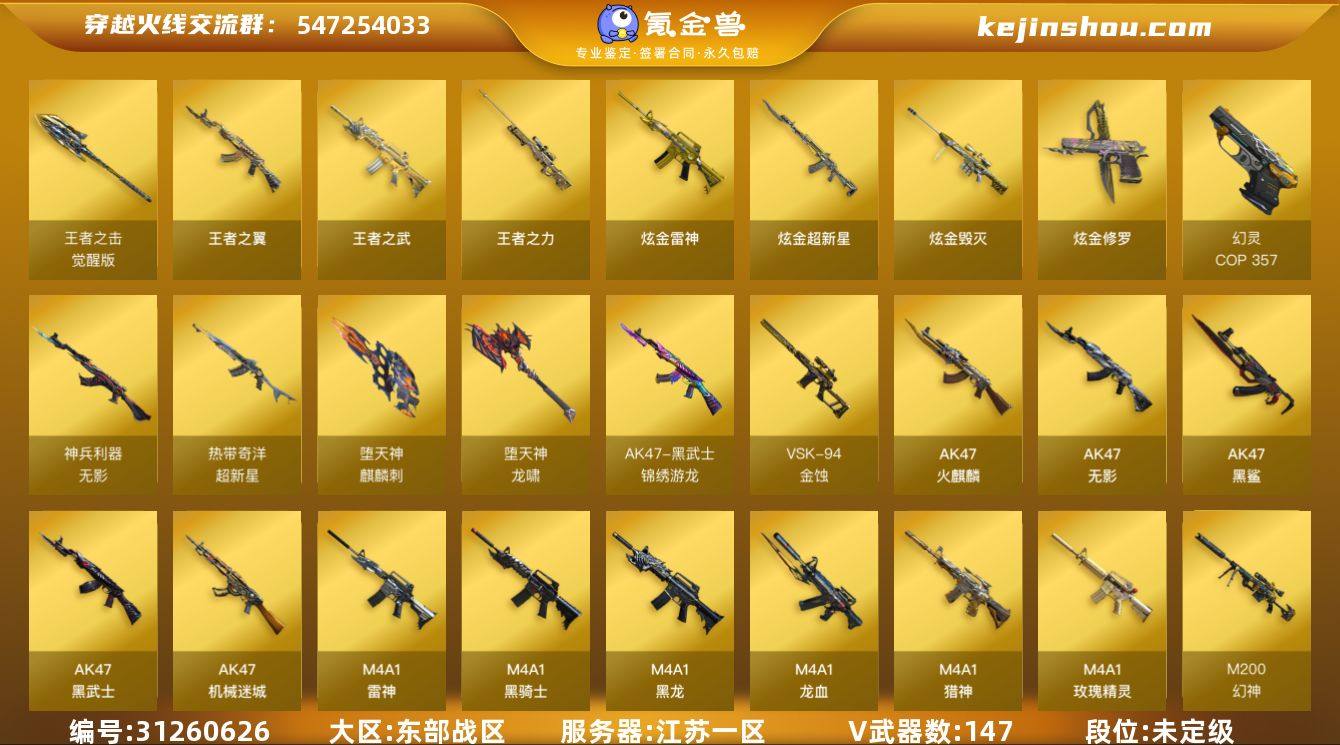 江苏一区-153V-13王者-9炫金 【热门武器】:G36C-幻影,QBZ03-金色蔷薇,Scar Light-白虎,HK417-朱雀,M200-幻神,死亡之眼,荣耀世冠-火麒麟,荣耀世冠-雷神,柯尔特-冠军之特,荣耀世冠-柯尔特,M4A1-黑骑士,汤姆逊-烈龙*6,RPK-盘龙*6,加特林-炼狱*2,羊驼玩偶,雷神-小红,火麒麟-绝迹,COP 357-幻灵,沙鹰-修罗*5,炽芒蝶刃,炽芒蝶刃-冠军炽芒皮肤 【王者炫金武器】:王者之翼*2,王者之武,王者之力,炫金骑士,炫金雷神*2,炫金武士,炫金超新星,炫金毁灭*3,炫金修罗 【音效卡】:M200-幻神音效卡,AK47-火麒麟音效卡,M4A1-雷神音效卡*2,M4A1-黑龙音效卡,M4A1-黑骑士音效卡*2,Barrett-毁灭音效卡,AWM-裁决音效卡,Scar Light-白虎音效卡,传情小小语音包 【皮肤】:幻神-冠军之幻,幻神-宠儿-2021MVP,M200-幻神-N9-2022MVP,幻神-电流骇客 皮肤,幻神-星火小队签名臻藏版 皮肤,白虎-电玩粉兔皮肤,ScarLight-白虎-冠军之虎皮肤,白虎-巅峰荣耀 皮肤,QBZ03-CFS2024 皮肤,裁决-胜者为王 皮肤,星神-巅峰荣耀 皮肤,烈龙-星空,雷神-荣耀之魄,M4A1-雷神-CFS 2019,雷神-耀金皮肤,雷神-冠军之魄,雷神-维纳斯皮肤,火麒麟-华夏之心,毁灭耀金皮肤,毁灭-星空,毁灭-冠军之怒,毁灭-CFS2020,毁灭-BEAN-2020MVP,毁灭-风暴,毁灭-直播专属,黑龙-能量核心*2,黑龙-暗月,黑龙-冠军之武,黑骑士-冠军之势,黑骑士-CFS2021,黑骑士-电玩青兔皮肤,无影耀金皮肤,幻影-破浪逐光 皮肤,烈火-动感闪耀 皮肤*2,战神-粉色甜心皮肤,战神-紫绶金章皮肤*5,战神-流金岁月皮肤*4,天龙-能量核心,极光-能量核心,修罗-冠军之魂,屠龙-荣耀之锋,龙啸-冠军之啸,龙啸-青青莓果 皮肤,擎天-冠军之击*2,炽芒蝶刃-冠军炽芒皮肤 【角色】:零,迷迭香,鹰,关小雨,玄豹,战地猎狐,王者-零,奇洋探