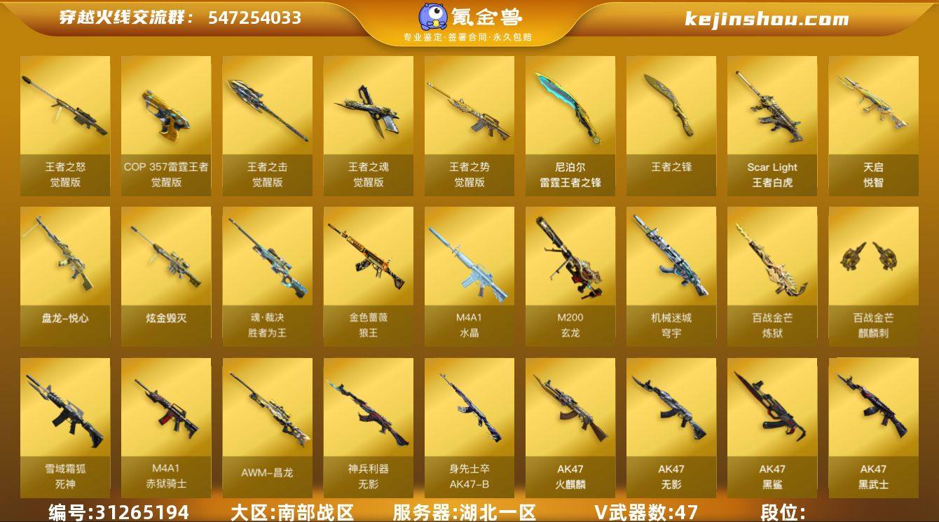 南部战区(湖北一区)ys【爆破号】传说【传说夜影】47v【M200-幻神套+皮/黄忠,Kar98k-星神,王者白虎,QBZ03-天罚,QBZ03-金色蔷薇+皮/枪娘阿敏,Barrett-毁灭,COP 357-雷霆王者,斩神刀-雷暴,QBZ03-吕布,Colt1911-大黄蜂】10王者【王者白虎,王者之势,王者之怒,COP 357-雷霆王者,王者之魂,雷霆王者之锋,王者之锋,王者之击,天启-悦智,盘龙-悦心】2炫金【炫金毁灭】9角色【葵,不败狙神,零·纪元,战地猎狐,葵-阿尔法武装,王者-葵-貂蝉,王者玲珑,修道士,雪域霜狐】8音效【M200-幻神音效卡,Barrett-毁灭音效卡,Barrett-极光音效卡,Barrett-碧霄极光音效卡,AK47-火麒麟音效卡,炼狱-百战金芒-庆典舞曲音效卡,柯尔特-百战金芒-庆典舞曲音效卡,死神-雪域霜狐-怀旧音效卡】32皮【幻神-黄忠,裁决-运输船,擎天-傲竹金蛇,屠龙-惊鸿,烈龙-星空,毁灭-直播专属,毁灭-星空,毁灭-墨兰,火麒麟-心动糖果,M4A1-战神赵云,火麒麟-战神关羽,金色蔷薇-枪娘阿敏,雷神-虎将,雷神-神秘按键,天龙-传奇70KG】vip4 截图展示段位不代表实际段位 如赛季更新等不可抗拒因素发生变化、时限道具不保证所剩时间
