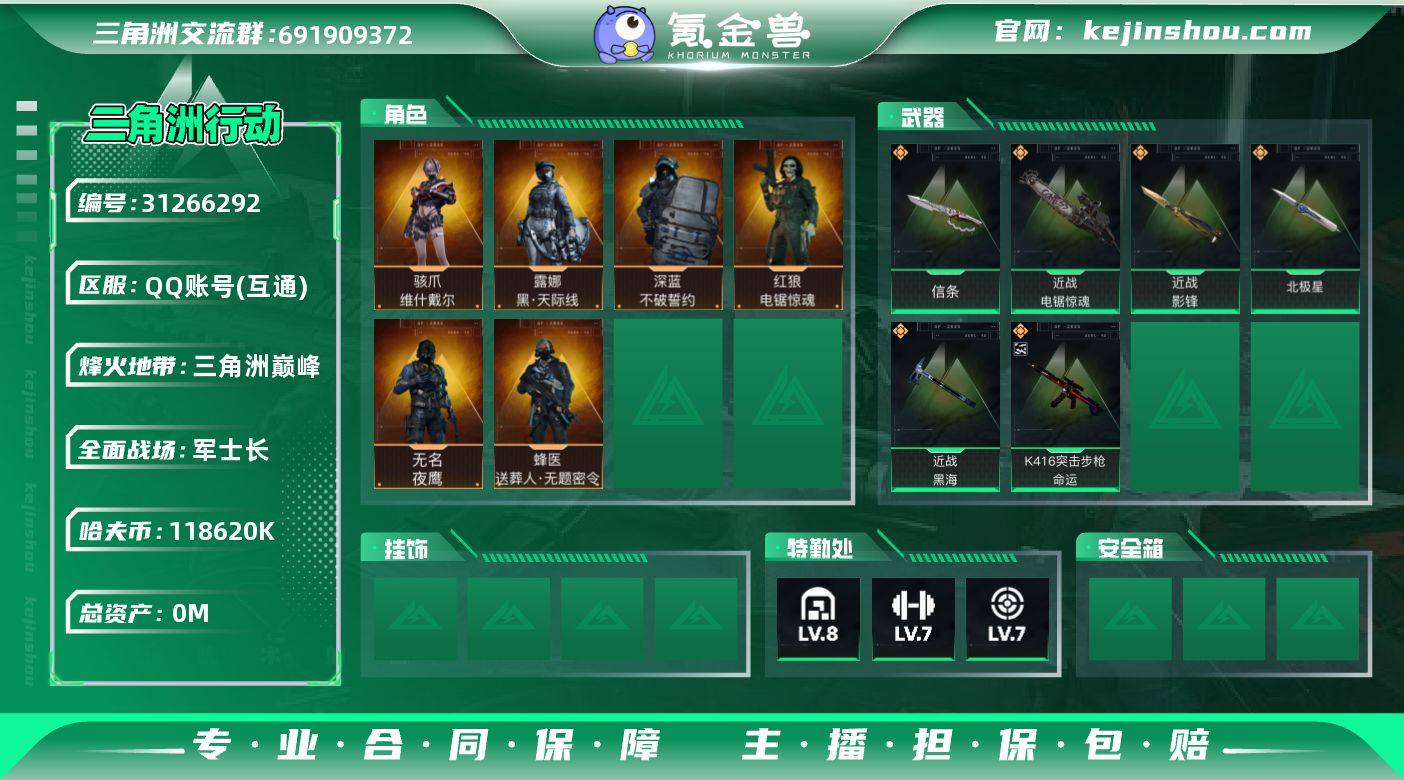 ABC11253/QQ区/钱包注销/【总资产:439.41M+哈夫币:11862W+近战武器-影锋+近战武器-黑海+近战武器-北极星+近战武器-电锯惊魂+近战武器-信条+K416突击步枪-命运(优品B)+骇爪维什戴尔+露娜黑天际线+蜂医送葬人无题密令+无名夜鹰+红狼电锯惊魂+深蓝不破誓约】武器皮肤233;烽火60级:三角洲巅峰,战场:军士长Ⅲ,【安全箱】基础安全箱;【特勤处等级】仓库LV.8,靶场LV.7,训练中心LV.7;【捆绑包10】黑海捆绑包,北极星捆绑包,电锯惊魂捆绑包,维什戴尔捆绑包,鹅鸭杀捆绑包,黑天际线捆绑包,电锯惊魂干员捆绑包,特斯拉线圈捆绑包,捞点薯条捆绑包,信条捆绑包;【干员皮肤6】骇爪维什戴尔,露娜黑天际线,蜂医送葬人无题密令,无名夜鹰,红狼电锯惊魂,深蓝不破誓约;【典藏皮肤】K416突击步枪-命运(优品B);【近战皮肤】近战武器-影锋,近战武器-黑海,近战武器-北极星,近战武器-电锯惊魂,近战武器-信条,近战武器-黑鹰;【步枪皮肤】K416突击步枪-命运,M4A1突击步枪-阿米娅,M4A1突击步枪-蚀金玫瑰,ASh-12战斗步枪-鹅鸭杀,AK-12突击步枪-夜鹰,AK-12突击步枪-特斯拉线圈,SCAR-H战斗步枪-启航,CAR-15突击步枪-阿米娅,腾龙突击步枪-捞点薯条,K437突击步枪-北极星,KC17突击步枪-电锯惊魂,AKM突击步枪-林中猎手,QBZ95-1突击步枪-曙光,ASh-12战斗步枪-守夜人,ASh-12战斗步枪-无极限,M16A4突击步枪-竞赛选手,AUG突击步枪-蝮蛇,SG552突击步枪-尖端治疗,SG552突击步枪-深海恐惧,SCAR-H战斗步枪-囚徒,G3战斗步枪-哈夫克警备,PTR-32突击步枪-英雄,ASVal突击步枪-尖端治疗,ASVal突击步枪-典狱官,腾龙突击步枪-无垢,腾龙突击步枪-猎鳄行动,K437突击步枪-守护者;【冲锋枪皮肤】MP5冲锋枪-黑海,P90冲锋枪-信条,UZI冲锋枪-特斯拉线圈,SR-3M紧凑突击步枪-特斯拉线圈,勇士冲锋枪-能天使-午...
