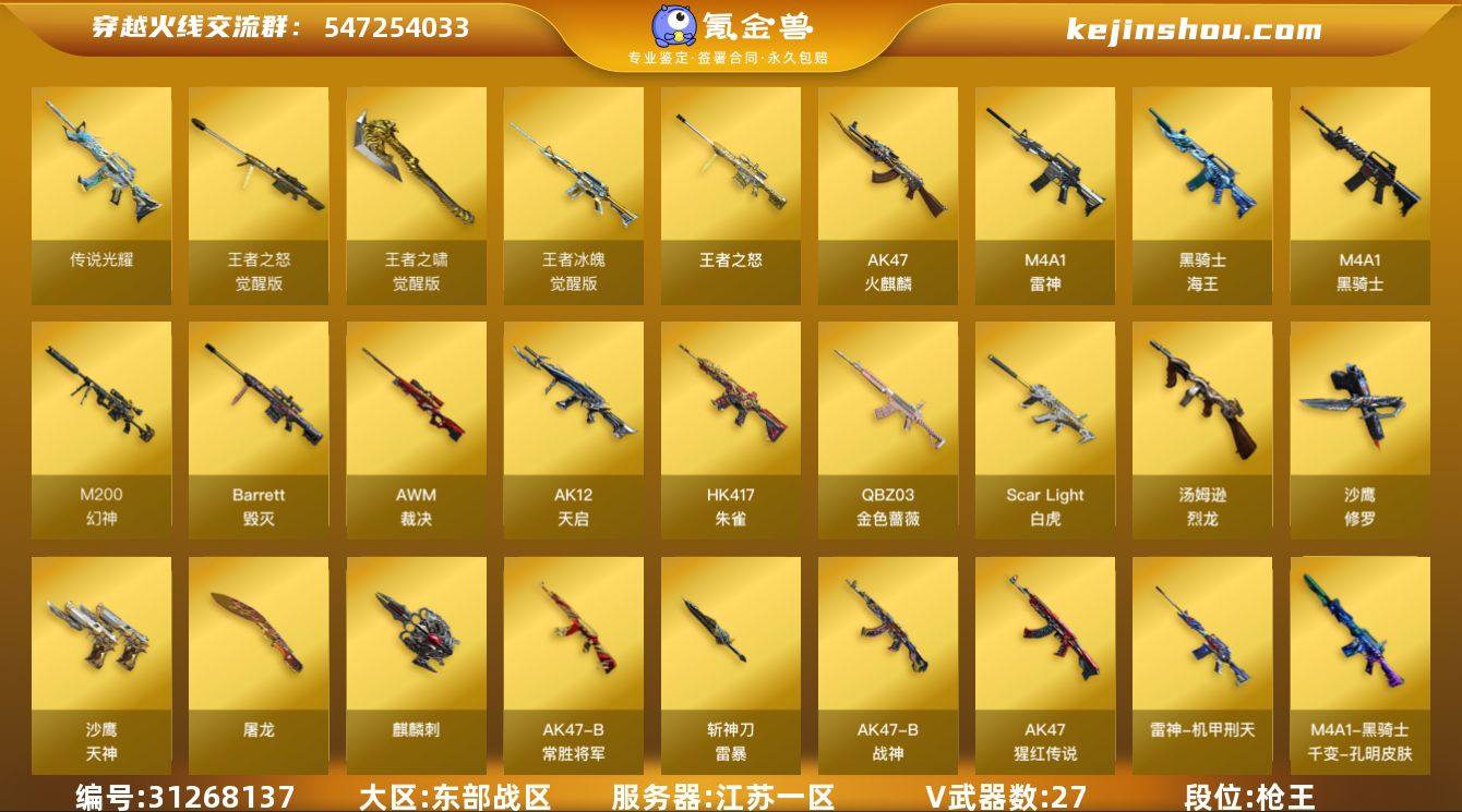 江苏一区-27V-6王者-0炫金 【传说武器】:传说光耀 【热门武器】:传说光耀,QBZ03-金色蔷薇,Scar Light-白虎,HK417-朱雀,M200-幻神,M4A1-黑骑士,汤姆逊-烈龙,沙鹰-修罗 【王者炫金武器】:王者之怒 【音效卡】:M200-幻神音效卡,M4A1-黑骑士音效卡 【皮肤】:幻神-丹凤,幻神-宠儿-2021MVP,M200-幻神-N9-2022MVP,雷神-暗月,雷神-机甲刑天皮肤,火麒麟-平天大圣,火麒麟-荣耀世冠AG,火麒麟-百城,火麒麟-心动糖果,M4A1-千变-孔明皮肤,战神-粉色甜心皮肤*2,战神-紫绶金章皮肤*3,战神-流金岁月皮肤*3,AK47-B-常胜将军-曹操*3,AK47-B-常胜将军-刘备*2,AK47-B-常胜将军-孙权,AWM-天龙-传奇70KG 【角色】:王者玲珑-小乔,炽天使,暗夜-X,初恋灵狐,风暴女*2,嘉年华灵狐,娟娟,灵狐-花神,曼陀罗-礼服,女战神,潘多拉-X,斯沃特-X,铁骑荣耀,雪莉杨-摸金校尉,樱-战斗天使 【人偶武器】:迷你深渊冰龙,迷你牛魔王,迷你波特博士*3,迷你牛牛,深渊终结者手雷,闪光弹-小乔,闪光弹-貂蝉,高爆手雷-大乔,迷你超能女侍 【挑战大师】:神圣爆裂者III,冰龙粉碎者-白马银枪,激光毁灭者III-白马银枪*3,激光毁灭者III 【英雄级武器】:AK47-火麒麟*2,M4A1-雷神*2,M4A1-黑骑士,AK12-天启,HK417-朱雀,Scar Light-白虎,QBZ03-金色蔷薇,AK-47-猩红传说,AK47-B-战神,王者冰魄-觉醒版,黑骑士-海王*2,AK47-B-常胜将军,Barrett-毁灭*2,AWM-裁决*2,M200-幻神,王者之怒-觉醒版,汤姆逊-烈龙,沙鹰-修罗,沙鹰-天神,屠龙,麒麟刺,斩神刀-雷暴,王者之啸-觉醒版 【道具】:超级背包,夺命之镰,防化服,金色流光-枪王排位*2,星辰流光-枪王排位,巅峰赛先锋-金色流光,枪王排位28赛季金色流光,枪王排位29赛季金色流光,电玩兔兔表情,EP战队名片,EP战队喷图,防弹头盔*4,防弹衣*4,C4工...