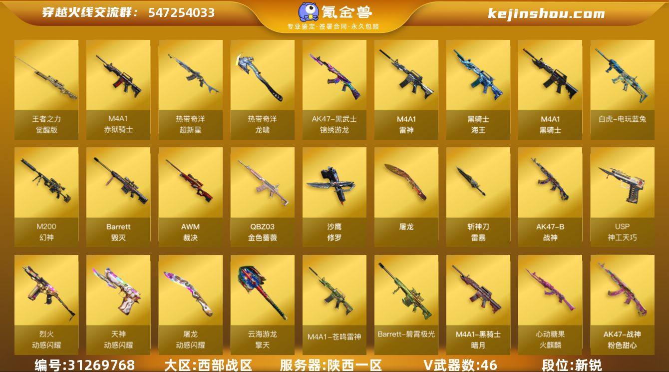 陕西一区-46V-1王者-0炫金 【热门武器】:QBZ03-金色蔷薇,M200-幻神,白虎-电玩蓝兔,M4A1-黑骑士,斯泰尔-蝴蝶,COP-白鲨*2,USP-雷暴,沙鹰-修罗*3 【音效卡】:AN94-超新星-热带奇洋音效卡,M200-幻神音效卡,Barrett-碧霄极光音效卡 【皮肤】:幻神-宠儿-2021MVP,雷神-冠军之魄,火麒麟-雷神,火麒麟-心动糖果,毁灭-冠军之怒,黑骑士-暗月,无影-能量核心,战神-粉色甜心皮肤*2 【角色】:奇洋探员,乔伊教练,修道士,云海玲珑,暗夜-X,电竞少女,飞虎队-X,风暴女,嘉年华灵狐,灵狐者-X,潘多拉-X,斯沃特-X,游珑儿,职业选手 【人偶武器】:COP-白鲨*2,斯泰尔-蝴蝶,AWM-灵狐-15周年嘉年华*2,迷你深渊冰龙,迷你牛魔王,迷你波特博士,夺魂,深渊终结者手雷,迷你艾比,迷你超能女侍,迷你巨石泰坦-魔花研究所 【挑战大师】:神圣爆裂者III,激光毁灭者III-白马银枪,神圣爆裂者-末日III 【英雄级武器】:M4A1-雷神*2,M4A1-黑骑士,黑武士-锦绣游龙,超新星-热带奇洋,QBZ03-金色蔷薇,烈火-动感闪耀,AK47-B-战神,黑骑士-海王,白虎-电玩蓝兔,Barrett-毁灭*2,AWM-裁决,M200-幻神,王者之力-觉醒版,沙鹰-修罗*3,USP-雷暴,USP-神工天巧,天神-动感闪耀,屠龙,屠龙-动感闪耀,擎天-云海游龙,龙啸-热带奇洋,斩神刀-雷暴,高爆手雷-雷暴*4,高爆手雷-神工天巧,手雷-动感闪耀,手雷-云海游龙,手雷-热带奇洋,闪光弹-雷暴*5,烟雾弹-雷暴*5,烟雾弹-神工天巧,M4A1-赤狱骑士,M4A1-苍鸣雷神,Barrett-碧霄极光 【道具】:BS战队炫彩背包,云山科技背包,亚洲杯纪念炫彩背包,全能枪王背包,奇洋探员-海龟背包,炫彩背包,热带奇洋炫彩背包,背包-洛丽塔,虎牙炫彩背包,超级背包,哔哩哔哩名片,女皇终结者-魔龙之吻,救世主-黑桃战神,黄金生化钩,绿色巨人,灵魂忍者*2,变异宝贝,迷雾幽...