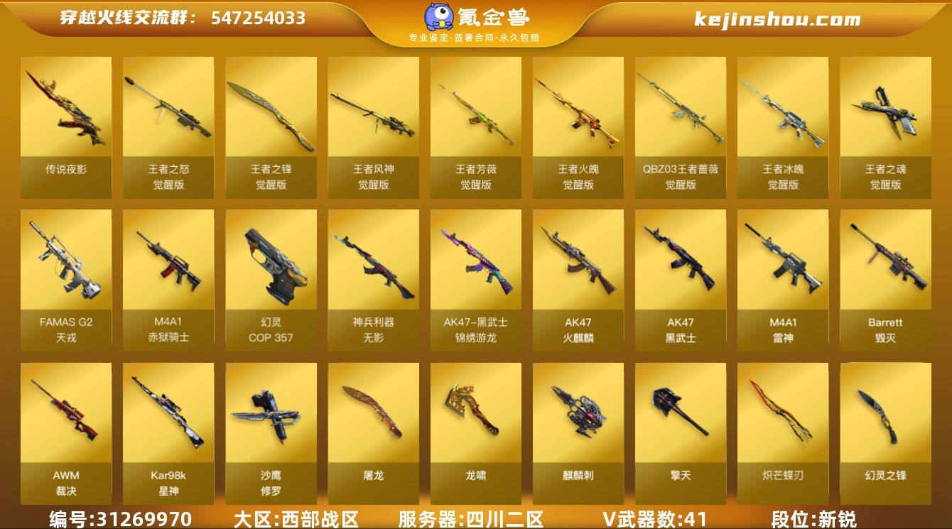 四川二区-54V-9王者武器数-0炫金武器数 【传说武器】:传说夜影 【传说角色】:传说艾莉莎 【热门武器】:传说夜影,Kar98K-星神,羊驼玩偶,COP 357-幻灵,沙鹰-修罗*3,炽芒蝶刃,金刚伞 【音效卡】:天神-动感闪耀 音效卡,M4A1-雷神音效卡,Barrett-毁灭音效卡,火线妹语音包 【皮肤】:裁决-过载 皮肤,星神-璀璨皮肤,雷神-虎将*2,雷神-脉冲核心,雷神-维纳斯皮肤,雷神-航星皮肤,火麒麟-华夏之心,火麒麟-轻羽皮肤,火麒麟-心动糖果,毁灭耀金皮肤,毁灭-冠军之怒,毁灭-直播专属,毁灭-英雄计划 皮肤,黑武士-典韦皮肤,龙啸-青青莓果 皮肤 【角色】:隼,王者凌霄,乔伊教练,暗夜-X,电竞少女,飞虎队-X,风暴女,嘉年华灵狐,娟娟,零-水下丽影,灵狐者-X,麻雀,曼陀罗-X,女主播,潘多拉-X,潘多拉-甜心教官,斯沃特-X,铁骑荣耀,兔囡囡,维纳斯,雪莉杨-摸金校尉,影武者-X 【人偶武器】:AWM-灵狐-15周年嘉年华,M37-葵,迷你深渊冰龙,迷你波特博士,迷你巨石泰坦-魔花研究所,沙鹰-夜玫瑰 【暴走生化】:超级对讲机 【挑战大师】:激光毁灭者III-白马银枪,神圣爆裂者-末日III 【英雄级武器】:AK47-火麒麟,M4A1-雷神,AK47-黑武士,QBZ03-天罚,无影-神兵利器,黑武士-锦绣游龙,FAMAS G2-天戎,烈火-动感闪耀,王者冰魄-觉醒版,王者火魄-觉醒版,QBZ-03-王者蔷薇-觉醒版,白虎之魄-觉醒版,王者芳薇-觉醒版,加利尔ACE-天袭,Barrett-毁灭,AWM-裁决,Kar98K-星神,王者之怒-觉醒版,王者风神-觉醒版,沙鹰-修罗*3,COP 357-幻灵,USP-神工天巧,王者之魂-觉醒版,天神-动感闪耀,屠龙*2,龙啸,擎天,麒麟刺,幻灵之锋,炽芒蝶刃,屠龙-动感闪耀,王者之锋-觉醒版,高爆手雷-幻灵*3,高爆手雷-神工天巧,手雷-动感闪耀,闪光弹-幻灵*2,闪光弹-神工天巧*2,烟雾弹-幻灵*2,烟雾弹-神工天...