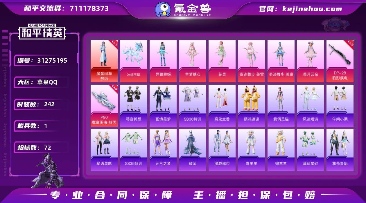 1红1车2枪6粉敖丙3级冰绡玉鳞 胖达头糯粉咩咩花灵羊梦糖心星月云朵账号编号:C4011 能否转区:能 区服系统选项:苹果QQ 有二次 王牌印记数量:2 历史热力值:26331 套装数量:62 枪械皮肤:72 红装1:敖丙3级 载具1:冰绡玉鳞 特效枪2:P90-魔童脑海 敖丙3级,DP-28-豹影疾电5级 粉装6:花灵,异瞳寒姬,羊梦糖心,奇迹舞步 美雪,奇迹舞步 美琪 ,星月云朵 紫装: 糯粉咩咩,兔兔白日梦, 滑翔尾迹:灵珠游龙,炫彩糖果 三级头:国宝胖达1-3, 三级包:第五大道1-3