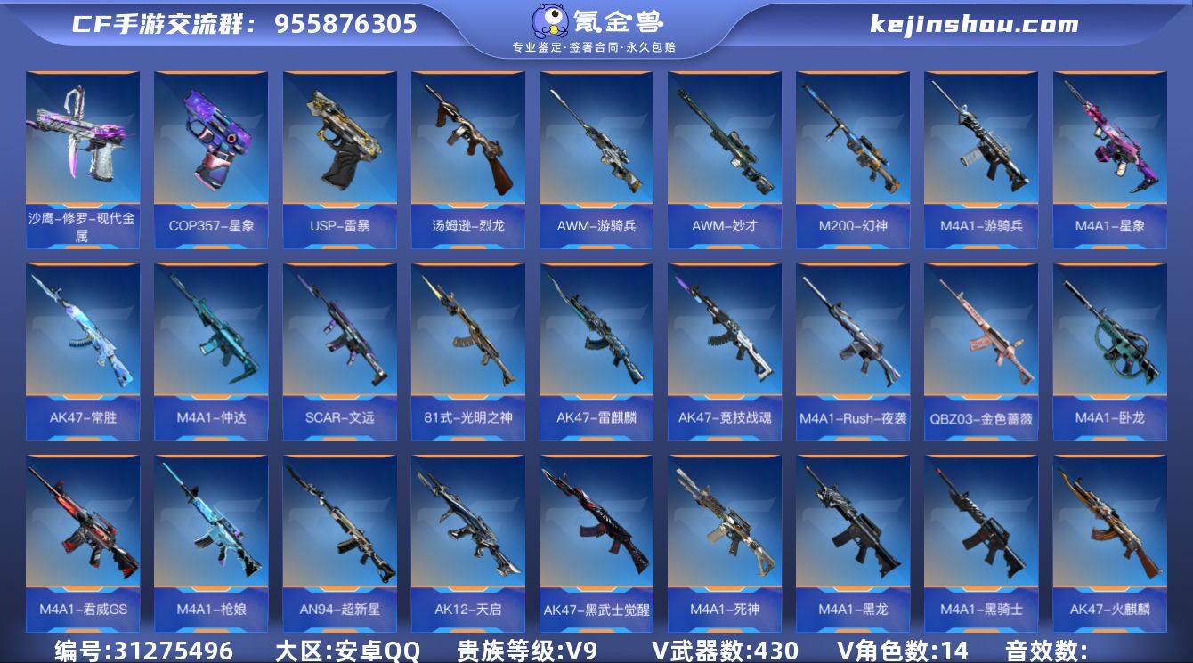 FC-19GB88 安卓QQ,成人号:是,角色等级:163,实名:有修改人脸机会/实名是本人,段位:枪王SSS,VIP等级:V9,V武器数量:430,V角色数量:14,V总数量:296,王者武器数:41,万化数量:729, 【人物角色】洛克,云悠悠,蝴蝶,关小雨,子涵,由乃,瞳,樱,大老师,堕天使,复仇者,运动宝贝兰,葵,铁骑,洛伊,暗影,刀锋队长,春节兰,幻影,夜玫瑰,斯沃特,武媚,云悠悠-心动起点,奥妹,雅典娜,零-水下丽影,月神-X,斯薇特, 【王者武器】王者之誉,王者之业,王者之竞手雷,王者之竞烟雾弹,王者之竞闪光弹,王者之魄-冠军珍藏,蝴蝶刀-天神,M12S-雷霆王者,王者之蝶,王者之势闪光弹,王者之势手雷,王者之心手雷,王者之翼手雷,王者之影手雷,王者之心烟雾弹,王者之心闪光弹,王者之翼闪光弹,王者之影闪光弹,王者之影烟雾弹,王者之势烟雾弹,王者之翼烟雾弹,王者之心,王者之影,王者之翼,王者之武,王者之势,王者之戮,王者之怒,王者之光,王者之魂,王者之轮,王者之电,王者之锋,王者之啸,王者之刺,王者之击,王者之迹,王者之痕,王者之城,王者之神,王者之狱, 【至尊套装】武至尊,翼至尊,势至尊,城至尊,光至尊,怒至尊,心至尊,魄至尊,神至尊, 【带V枪械】王者之锋-HeartShot,AWM-游骑兵-紫魇,王者之刺-冰霜奇迹,王者之击-冰霜奇迹,王者之痕-冰霜奇迹,王者之心手雷-燃竞之巅,王者之势手雷-冰霜奇迹,王者之心闪光弹-燃竞之巅,王者之势闪光弹-冰霜奇迹,王者之心烟雾弹-燃竞之巅,王者之势烟雾弹-冰霜奇迹,M4A1-仲达,M4A1-Rush-夜袭,M4A1-星象,M4A1-卧龙,M4A1-君威GS,M4A1-枪娘,M4A1-游骑兵,M4A1-死神,M4A1-黑龙,M4A1-黑骑士,M4A1-雷神,AK47-雷麒麟,消音毛瑟-常胜-铩魔,双管猎枪-黑骑士-暗月,AK47-竞技战魂,AK47-常胜,M4A1-黑龙-能量核心,M4A1-游骑兵-...