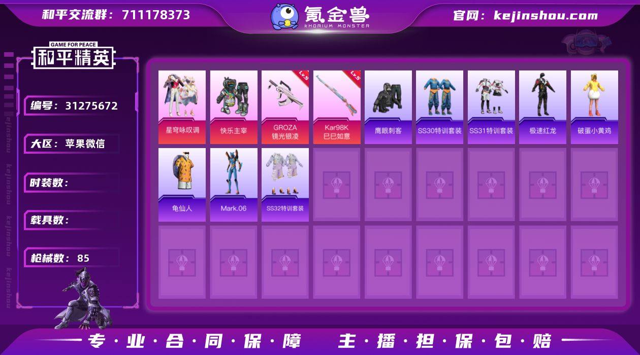 苹果微信 可二次 1粉装2特效枪66套装85枪皮 星穹咏叹调 Kar98K-巳巳如意(5级) GROZA-镜光银凌(5级) Mark.06 龟仙人 鹰眼刺客 破蛋小黄鸡 极速红龙 和平精英账号