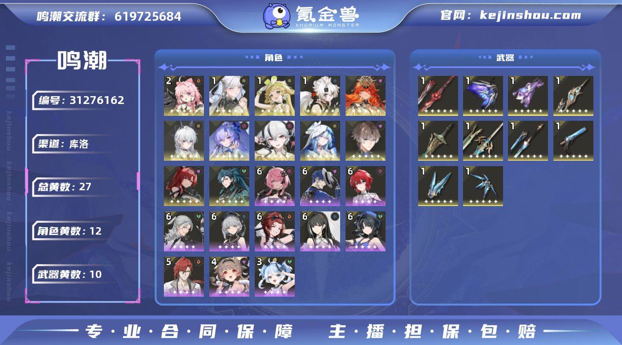74级,26黄,星声:6972,余波珊瑚:4,浮金波纹:12,12个五星角色:2命安可, 1命凌阳, 1命维里奈, 1命今汐, 忌炎, 吟霖, 相里要, 椿, 坎特蕾拉, 守岸人, 赞妮, 奥古斯塔;11个四星角色:满命秧秧, 满命炽霞, 满命白芷, 满命丹瑾, 满命桃祈, 满命秋水, 满命渊武, 满命散华, 5命莫特斐, 4命灯灯, 3命釉瑚;9个五星武器:精1苍鳞千嶂, 精1停驻之烟, 精1时和岁稔, 精1千古洑流, 精1诸方玄枢, 精1裁春, 精1漪澜浮录, 精1星序协响, 精1擎渊怒涛