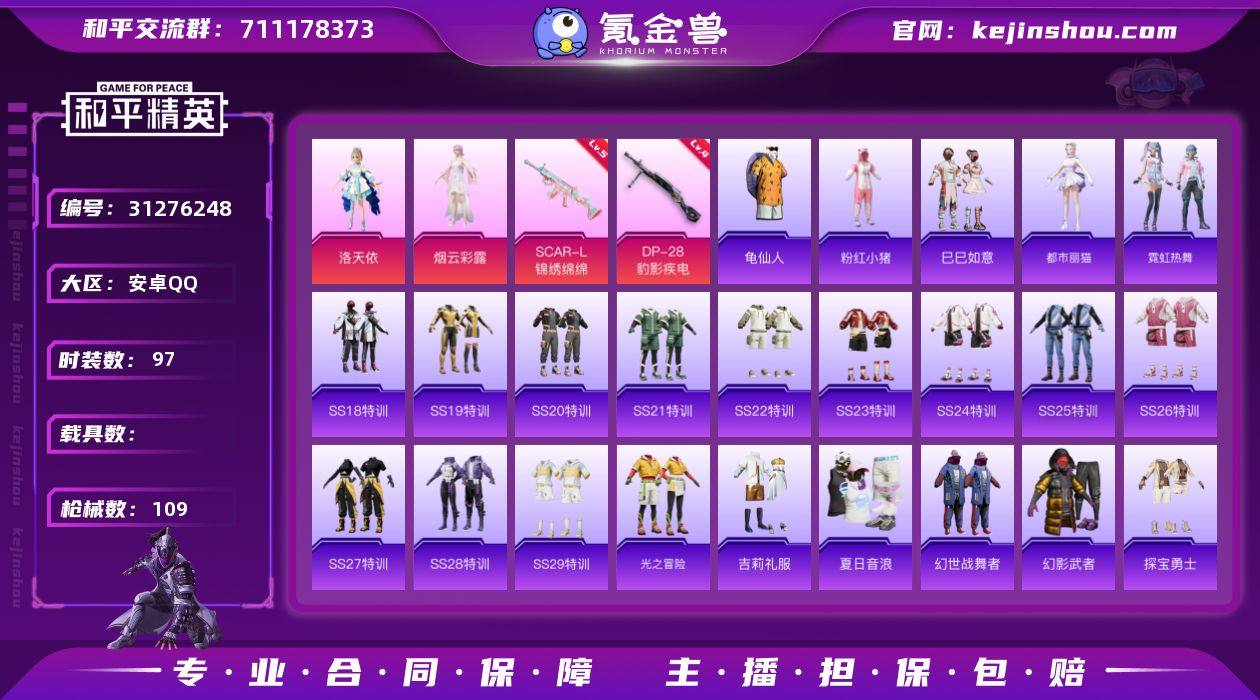 不可二次 安卓 手Q-2粉装-2特效枪-0载具-0粉色飞行器-30141热力值-8王牌印记-97套装-109枪皮 QW262514 【热门品类】:套装-龟仙人,套装-粉红小猪 【粉色套装】:角色-洛天依,角色-烟云彩露 【粉色枪皮等级】:SCAR-L-锦绣绵绵(五级),DP-28-豹影疾电(四级) 【粉色枪皮】:SCAR-L-锦绣绵绵,DP-28-豹影疾电 【粉色降落伞】:洛神天依降落伞,青春物语降落伞,垂柳戏鸭降落伞,繁龙极客降落伞,精灵梦叶罗丽降落伞 【稀有套装】:套装-龟仙人,套装-巳巳如意,角色-都市丽猫,套装-霓虹热舞 【稀有枪皮】:AKM-彩虹符号,AKM-灼热熔岩,AKM-破晓战魂,AKM-霓虹街区,AKM-龙的传人,M16A4-幻世战舞者,M16A4-甜心亚梦,M16A4-红色方程式,M16A4-蓝色火焰,SCAR-L-炫彩节奏,SCAR-L-玉兔迎春,SCAR-L-红色方程式,M416-糯团青竹,M416-红色方程式,M416-蓝色火焰,GROZA-彩虹符号,AUG-天降萌叽,AUG-幻影战神,AUG-耀粉歌者,QBZ-彩虹符号,QBZ-洛神天依,M762-天降萌叽,M762-彩虹符号,M762-牛气冲天,Mk47-洛神天依,AC-VAL-天降萌叽,AC-VAL-甜心亚梦,蜜獾-天降萌叽,UZI-啾咪啾咪,UZI-天降萌叽,UZI-红色方程式,UMP45-涂山之恋,UMP45-生命誓言,UMP45-蓝色火焰,Vector-焰鹰斗篷,Vector-生命誓言,汤姆逊-天降萌叽,汤姆逊-耀粉歌者,Kar98K-彩虹符号,Kar98K-炫彩节奏,Kar98K-红色方程式,M24-炫彩节奏,M24-奇异狩猎者,AWM-焰鹰斗篷,AWM-鎏金朋克,AWM-垂柳戏鸭,AWM-炙焰牛王,AWM-音爆索尼克,SKS-炫彩节奏,VSS-彩虹符号,Mini14-炫彩节奏,Mini14-耀粉歌者,SLR-彩虹符号,MK20-H-墨染幽兰,S686-彩虹符号,S686-红色方程式,S1897-炫彩节奏,S12K-破晓战魂,S12K-幻世战舞者,DBS-焰鹰斗篷,DBS-彩虹符号,DBS-甜心亚梦,DBS-幻彩电音,M249-破晓战魂,M249-糯团青竹,DP-28-焰鹰斗篷,DP-28-...