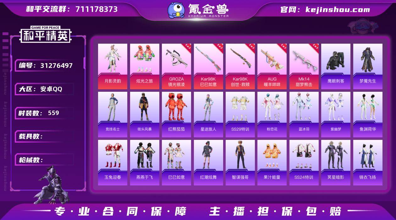 AL671519 热力值49848 枪皮数量167 粉装数2 套装数量139 时装数559 战备数149 【是本人】 【可排位】 【包人脸】 【是】 【不支持】 【未绑定或可换绑】 【无换绑CD】 其他武器皮肤162 头盔63 战备18 其他武器皮肤:Mk47-乌木金纹,SCAR-L-海盐豹豹,SCAR-L-星途旅人,SCAR-L-黄金龙骨,SCAR-L-夜灯,SCAR-L-红色方程式,SCAR-L-玉兔迎春,G36C-暗夜玫瑰,G36C-乌木金纹,M762-天降萌叽,M762-彩虹符号,M762-瑞龙福将,M762-甜心宝贝,蜜獾-娇憨猪猪,蜜獾-天降萌叽,蜜獾-乌木金纹,GROZA-彩虹符号,GROZA-恐龙拽拽,GROZA-田园牧歌,AKM-龙的传人,AKM-破晓战魂,AKM-虎虎生威,AKM-夜灯,AKM-冰凉西瓜,AKM-彩虹符号,AKM-霓虹街区,M16A4-幻世战舞者,M16A4-冰河战士,M16A4-蓝色火焰,M416-萌萌史莱姆,M416-红色方程式,M416-糯团青竹,M416-蓝色火焰,M416-夜灯,AUG-闲梦青缨,AUG-2P战斗服款,AUG-耀粉歌者,QBZ-飞驰魅影,QBZ-彩虹符号,AC-VAL-天降萌叽,AC-VAL-闲梦青缨,AC-VAL-乌木金纹,Kar98K-彩虹符号,Kar98K-飞驰魅影,Kar98K-红色方程式,Kar98K-乌木金纹,Kar98K-顶峰精英,AWM-垂柳戏鸭,AWM-焰鹰斗篷,AWM-天降萌叽,AWM-乌木金纹,AWM-雷霆特警,AWM-音爆索尼克,莫辛纳甘-乌木金纹,M24-乌木金纹,Win94-瑞龙福将,M200-乌木金纹,M200-惊鸿侠骨,AMR-乌木金纹,Mini14-耀粉歌者,Mini14-香桃花海,Mini14-千面幻镜,Mini14-旋转彩虹,Mk14-乌木金纹,Mk14-冰河战士,Mk14-紫幽梦,Mk14-治愈之星,VSS-彩虹符号,VSS-田园牧歌,VSS-香桃花海,SLR-彩虹符号,SLR-娇憨猪猪,M417-惊鸿侠骨,SKS-炫彩节奏,MK20-H-乌木金纹,MK200-H-星途旅人,UMP45-生命誓言,UMP45-炫光之旅,UMP45-蓝色火焰,UMP45-海盐豹豹,UMP45-夜灯,UZI-影袭,UZI-红色方程式,UZI-啾咪啾咪,UZI-冰河战士,UZI-...