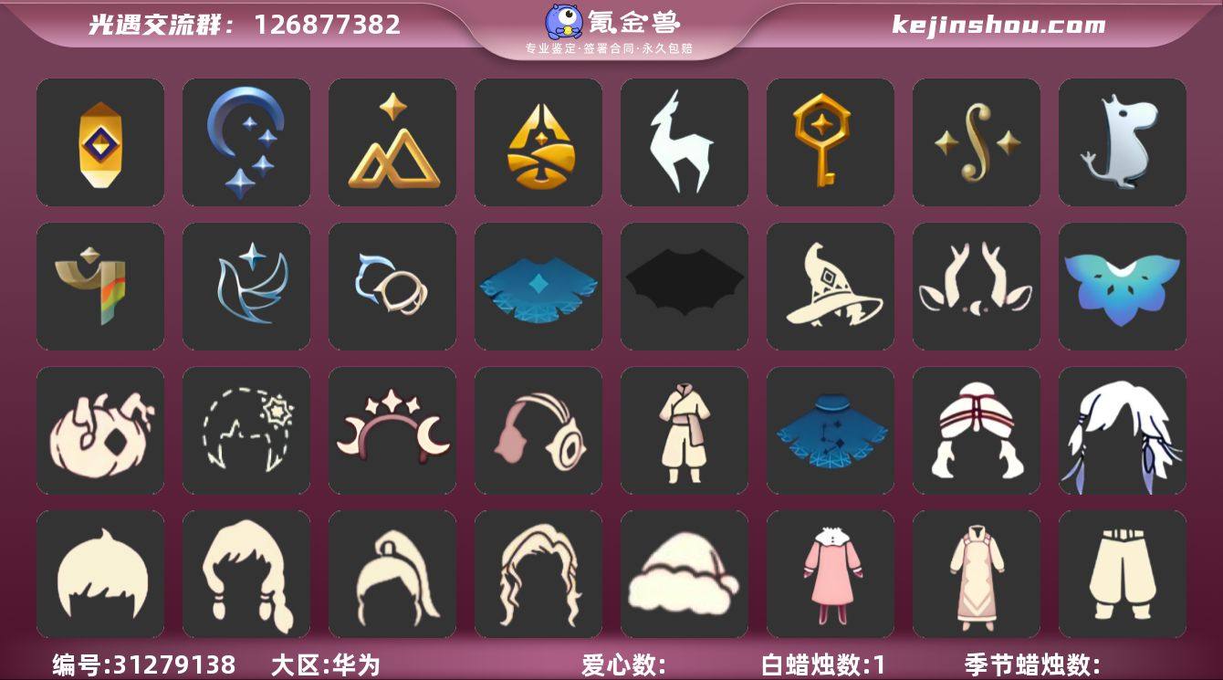 白枭透明蝶翼巫师帽蝙蝠斗武士裤王子围巾TGC斗欧若拉之翼圣诞鹿角玫瑰花 13季 11翼账号 资源:蜡烛13 爱心19 红烛1 翼11 已毕业地图:暮土 晨岛 毕业季节: 小王子季 风行季 潜海季 表演季 破晓季 欧若拉季 拾光季 归巢季 九色鹿季 姆明季 夜行季季卡 青鸟季半毕业 双星季半毕业 毕业物品:小王子发型 小王子套装 玫瑰花 小王子套装 多羽发饰 蓝黄羽袖 单边小辫 暗红斗篷 氧气面具 黄眉企鹅面具 燕尾斗篷 白枭发型 双翼遥鲲斗篷 冥龙斗篷 留辫蘑菇头 高领舞服 透明蝶翼斗 粗框眼镜 季卡相机 西部帽 五塑彩羽发 五塑彩带斗 九色鹿丸子头 九色鹿丝带裤 九色鹿飞天斗篷 姆明大伞 姆明抱枕 姆明长裙 稀有礼包: 青衫落拓礼包 粽叶斗篷 白雪斗篷 暖冬瑞雪 蛛丝斗篷 蝙蝠斗 新春福娃礼包 年年有鱼礼包 TGC黑底 王子围巾 星球夹克 欧若拉之翼 大桔大利 鲤跃龙门 雪花发夹 贝壳发夹 玉兔头饰 星月头冠 九色鹿角 彩虹耳钉 彩虹耳机 巫树犄角 圣诞鹿角 皮皮猫套装 南瓜头 巫师帽 阔腿牛仔 雪人暖靴 音韵吉他 祥云纸伞 中秋灯笼 夏日阳伞 狐狸背包 冥龙南瓜 小船 热门裤子: 鳐鲲长裙 绑带舞服 奔月长袍 妮妮长裙 海洋武士裤 白棉裤 搓澡巾 武士裤 小王子服 羽袖长袍 小丑服 探险燕尾服 米色西装裤 阔腿牛仔 雪人暖靴 热门面具:矮人面具 狐狸面具 黄鼠狼面具 红兔面具 氧气面具 黄眉面具 一字眉 盲僧眼罩 红脸蛋面具 黑脸 粽叶面具 鸟羽面具 热门发型:海草头 爆炸头 大胡子 卡卡 平菇 龙骨 箬笠 公主头 粗辫 水母头 书虫 总裁 正太 高马尾 明制帽 郡主头 斗笠 绿丝带 虚荣 小王子发型 白枭 圆环发辫 留辫蘑菇头 李逍遥发型 彩色脏辫 彩羽发型 兔子...