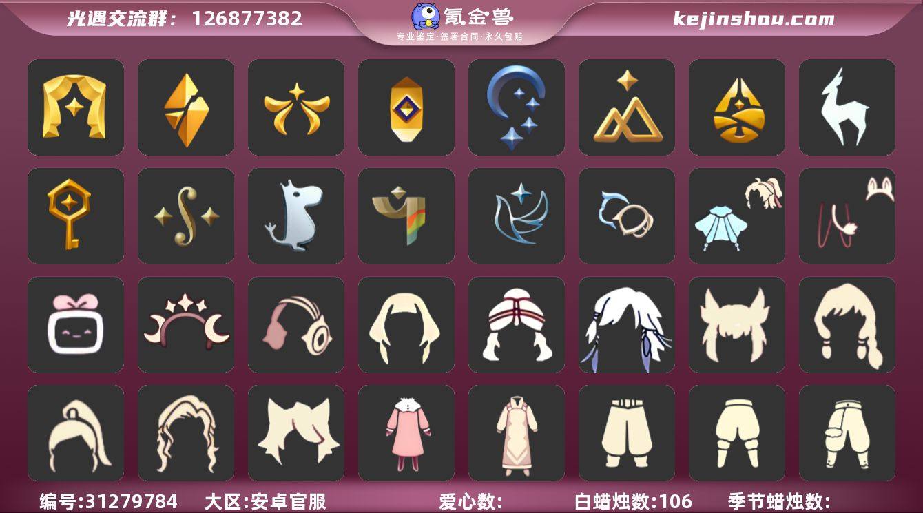 编号S002 vivo服 可换实名 可直接换绑 详情请看衣柜截图 蜡烛数:4018 爱心数:216 季节已毕业:圣岛季 预言季 梦想季 集结季 小王子季 风行季 表演季 欧若拉季 追忆季 九色鹿季 筑巢季 二重奏季 姆明季 彩染季 青鸟季 双星季 珍稀物品:遥鲲斗篷 阿努比斯 玫瑰花 白枭 透明蝶翼斗 完成地图:全图毕业 礼包:向日葵连衣裙 兔子鞋 运动鞋 新年裤 暗彩装扮 福娃 周年影院套装礼包 姆明饰品套装 树精肩饰 奔跑发型 海蓝波浪发型 巫师 橘子 小狗周年发饰 贝壳 兔子 心心相印发饰礼包 四叶草 粽子发饰礼包 小黄鸭发饰礼包 星月头饰 新年耳钉 彩虹耳钉 彩虹耳机 鹿角 创始人 围巾 欧若拉之翼 蝙蝠套 透明蛛网 瑞雪 青衫落拓礼包 妮妮斗篷 吉他 人声乐器 红伞 献瑞折扇礼包 恶作剧飞天扫帚 茶桌 必胜客联动分享披萨背饰礼包 南瓜 雪花球 奥利奥抱枕 裤子:背带裤 遥鲲裙 绿丝裤 乞丐裤 古风裤 小布裙 姆明季·裤子 妮妮裙子 彩染挑衅艺伎裤子 青鸟伐木不舍裤子 海浪长裤 五周年裤子 遥鲲沙滩短裤 万圣裤 蛇年裤子 毛靴裤 搓澡巾 灯笼裤 紧身裤 工装裤 连体裤 武士裤 雪人裤 击剑裤 王子服 渔夫裤子套装 杂技裤 猫猫裤 小丑裤 绿长裤 鞋子:长筒凉鞋 毛靴 布鞋 鱼嘴凉靴 姆明季·鞋子 彩染挑衅艺伎鞋子 彩染跳跃舞者鞋子 青鸟伐木不舍鞋子 万圣鞋 芭蕾鞋 寻宝长靴 面具:矮人面具 黄鼠狼 大胡子面具 阿努比斯 老头面具 蜘蛛面具 黄眉企鹅面具 白眉面具 忧郁脸面具 白环面具 白色条纹面具 红色条纹面具 白色条纹面具 绿色条纹面具 星绘面具 贴花面具 黑脸白眉面具 九色鹿面具 黑脸 面饰:蒙眼面巾 麦穗 蔚蓝眼镜 星星眼镜 肯德基联动眼镜 青鸟毕业面饰 青鸟占卜智慧面饰 发型:公主 粗辫 书虫 总裁发型 正太 高马尾 明制 若笠 花环 斜刘海发型 卷发 虚荣 军帽 白枭 冥龙长辫 遥鲲长辫 吊环双辫发型 老兵凌乱...