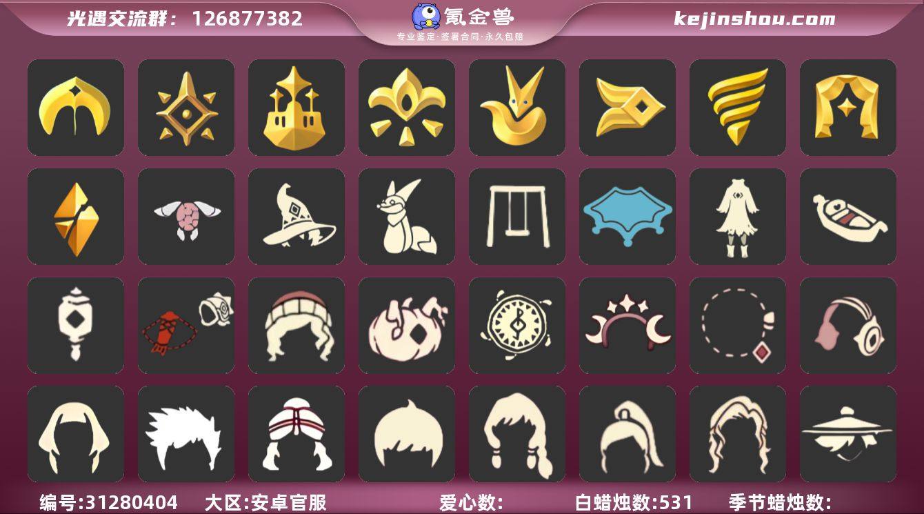蜡烛数量:192 爱心数量:78 翼数量:0 九色鹿季,筑巢季,二重奏季,姆明季,彩染季,青鸟季,双星季,迁徙季 青鸟毕业斗篷,彩染围巾斗篷,黑边红绒斗篷,红金,绿芽,海洋斗,双排扣斗 禁阁指甲盖发型,平菇发型,雨妈发型,飞天盘发,花环,若笠,猫耳 筑巢季·裤子,妮妮裙子,击剑裤,飞天裤 辉光羚羊面具,花纹面具,三角额纹面具 青鸟毕业面饰,红耳机 小红伞,姆明抱枕,筑巢季·小手办,雨伞,高音钢琴 平顶帽,金色音乐会,蓝色音乐会 必胜客联动分享披萨背饰礼包,渐变双马尾发型礼包,青衫落拓礼包,心心相印发饰礼包,献瑞折扇礼包,衔福献瑞礼包,线框斗篷礼包,粽子发饰礼包,周年影院套餐礼包,小狗周年发饰,海龟斗篷,爱丽丝围裙套装礼包,仙境茶会门扉礼包,彩虹武士裤,向日葵连衣裙,史力奇帽子,史力奇套装,姆明饰品套装,蝙蝠套,围巾,星球斗,小狐狸,欧若拉之翼,九色鹿角,莲花斗,音乐桌,大耳狗抱枕,大耳狗装扮,绊爱,大铁头,鹿角,荷叶伞,牛仔裤,兔子鞋,大耳狗发饰,运动鞋,秋千,茶桌,餐桌,福娃,小船,吉他,彩虹帽,雪花球,橘子,贝壳,黄伞,红伞,兔子,朋克,雪花,电吉他,彩虹耳钉,彩虹耳机,新年裤,魔法棒,奥利奥,四叶草,小提琴,雪人鞋,新年耳钉,创始人,飞鸟纸伞,日光耳环,满月耳坠,有友帽子 卖家说:热门礼包全有,有代跑到五月,活动代币和任务,每天20根蜡烛以上,染料能用一辈子用不完