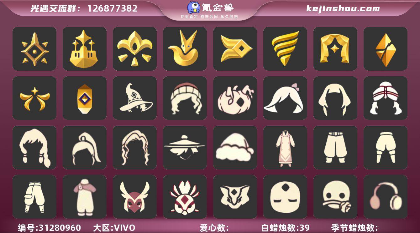 iOS官服 邮箱账号 5珍稀物品 15毕业季 6毕业图 307蜡烛 【珍稀物品】白枭(帝企鹅发),阿努比斯(狗头),玫瑰花,彩虹围巾(五塑彩带斗),鳐鲲斗篷 【季节已毕业】双星季,圣岛季,预言季,梦想季,集结季,小王子季(王子季),风行季,潜海季,表演季,追忆季,夜行季,拾光季,归巢季,九色鹿(九色鹿季),二重奏季 【完成地图】晨岛,云野,雨林,霞谷,墓土(暮土),禁阁 【礼包】记忆水晶礼包,周年影院套餐礼包,兔子鞋(兔子拖鞋),暗彩装扮(彩虹武士裤),爱心眼镜,蝴蝶结(大蝴蝶结),姆明饰品套装(姆明尾巴),向日葵套(夏日有友礼包),绒帽(温暖绒帽),巫师(巫师帽),绊爱(绊爱斗篷)(绊爱礼包),橘子(大橘大利),贝壳(贝壳发饰),兔子(玉兔头饰)(玉兔发饰)(兔子发饰),四叶草(四叶草头饰),彩虹耳钉(彩虹耳饰),日光耳环,枯角(巫树犄角),鹿角(圣诞鹿角),创始人(创始人斗篷),围巾(小王子斗篷)(小王子围巾),星球斗(星球夹克),福娃(福娃礼包)(春之日礼包)(铜钱斗),蝙蝠套(蝙蝠斗篷)(南瓜头),蜘蛛斗(蛛丝斗篷)(蛛网斗篷),透明蛛丝(透明蜘蛛斗),瑞雪(瑞雪斗篷)(暖冬瑞雪),红伞(瑞气纸伞),灯笼(中秋灯笼),黄伞(夏日阳伞),秋千(情人秋千),跷跷板(情人跷跷板),茶桌(花憩茶桌),餐桌(野餐礼包),小狐狸(狐狸背包),小船(情人小船),仙境茶会门扉礼包 【裤子】筑巢季·裤子(设计师长袍),青鸟尊贵蓬头裤子(蓝色燕尾服),飞天裤(柔缎花边连)(九色鹿丝带裤),王子服(小王子套装),武士裤,背带裤,搓澡巾,击剑裤 【面具】黄眉企鹅面具,夜行毕业面具(棕熊面具),呼吸面具(潜水面具),贴花面具(丛林黑面具),阿努比斯,凤凰面具 【面饰】黑框眼镜(粗框眼镜),红耳机 【项链】围巾(肩带) 【发型】小王子发型,单侧绑发(单边小辫),飞天盘发(九色鹿丸子头),虚荣,归巢毕业发型(五塑彩羽发),若笠(箬笠) 【头饰】平顶帽,蓝色音乐会(蓝色音乐符),行军锅头盔(六边锅帽子)(双耳锅帽子),牛仔帽(西...