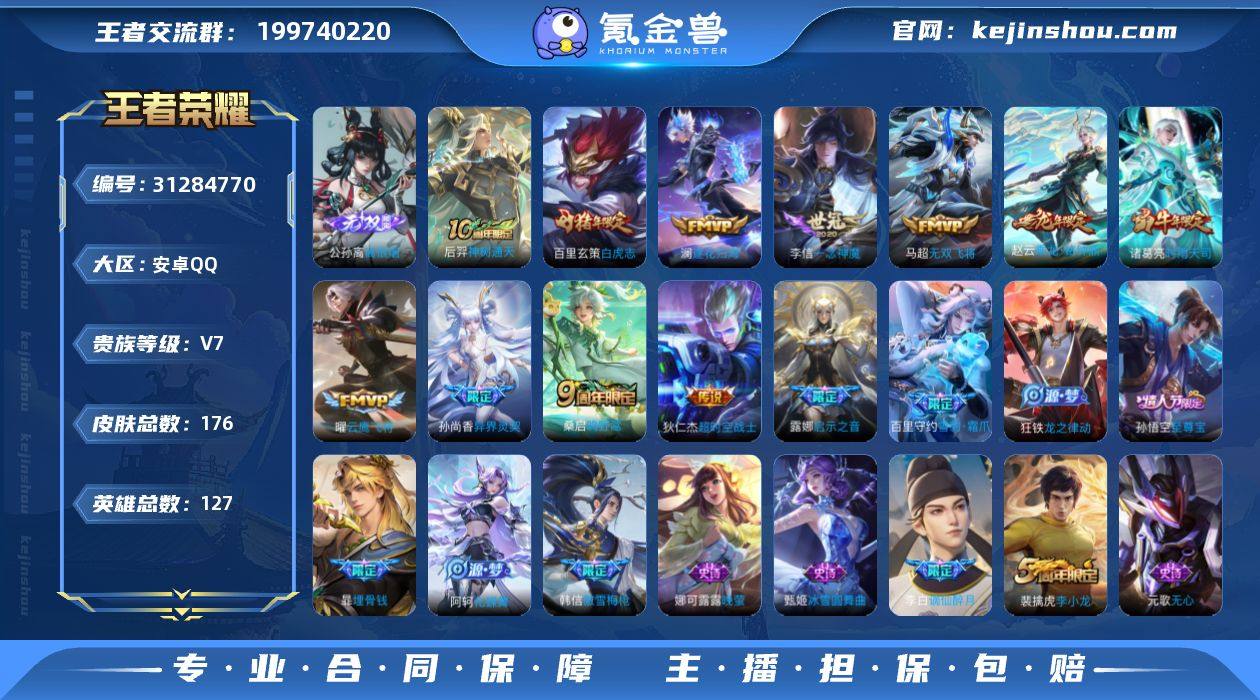 【背包有水晶】安卓Q-V7-尊贵铂金III段位-127英雄-176皮肤-1无双-12传说-51史诗 【无双皮肤】:公孙离离恨烟 【传说皮肤】:后羿神树通天,桑启鸣野蒿,赵云乘龙铭钟鼎,澜逐花归海,马超无双飞将,露娜启示之音,孙尚香异界灵契,诸葛亮时雨天司,曜云鹰飞将,李信一念神魔,百里玄策白虎志,狄仁杰超时空战士 【限定皮肤】:公孙离离恨烟,暃埋骨钱,李白谪仙醉月,狄仁杰阴阳师,赵云皇家上将,孙尚香异界灵契,庄周高山流水,高渐离玩趣恶龙,元歌无心,夏侯惇朔风刀,典韦穷奇,狄仁杰魔术师,狄仁杰万华元夜,达摩沙漠行僧,项羽海滩派对,老夫子醍醐杖,程咬金演武夺筹,露娜启示之音,韩信傲雪梅枪,兰陵王金庭之子,孙悟空至尊宝,李元芳云中旅人,钟馗驱傩正仪,杨玉环遇见飞天,蔡文姬繁星吟游,鬼谷子原初探秘者,鬼谷子五谷丰年,诸葛亮时雨天司,苏烈千军破阵,百里玄策白虎志,弈星混沌棋,沈梦溪大漠名商,明世隐疑决卦,裴擒虎李小龙,裴擒虎擒涛扼浪,狂铁御狮,云中君纤云弄巧,伽罗天狼溯光者,盾山御銮,上官婉儿梁祝,嫦娥拒霜思,鲁班大师探海日志,桑启海盐诗旅,艾琳女武神,张良古海寻踪,鬼谷子天穹祈灯,伽罗琥珀纪元,赵云乘龙铭钟鼎,沈梦溪龙舞盛年,刘邦剑破天穹,芈月浮光幕影,周瑜熔金海岸 【年限皮肤】:百里玄策白虎志,诸葛亮时雨天司,赵云乘龙铭钟鼎 【赛季限定】:典韦穷奇,狂铁御狮,盾山御銮,夏侯惇朔风刀,弈星混沌棋,明世隐疑决卦,老夫子醍醐杖,鬼谷子原初探秘者,狄仁杰万华元夜,程咬金演武夺筹,钟馗驱傩正仪,苏烈千军破阵,达摩沙漠行僧,兰陵王金庭之子,沈梦溪大漠名商,李元芳云中旅人,桑启海盐诗旅,裴擒虎擒涛扼浪,鲁班大师探海日志,张良古海寻踪,鬼谷子天穹祈灯,刘邦剑破天穹,东皇太一噬灭天穹,太乙真人谧流熔炉,亚瑟荣光之誓 【史诗皮肤】...