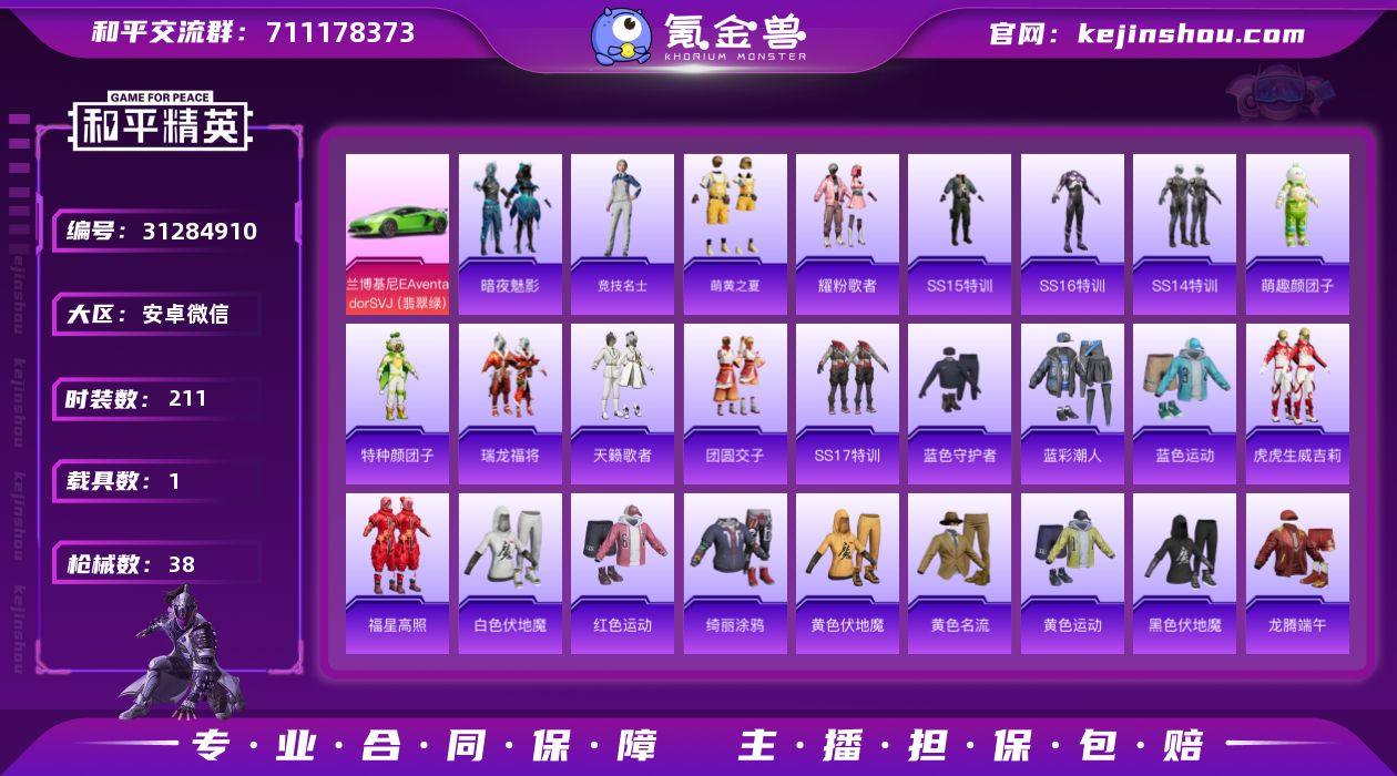 AL671598 【微信正常使用 游戏有防沉迷】 热力值12908 枪皮数量38 套装数量44 时装数211 载具数1 战备数37 其他武器皮肤38 头盔18 战备11 伙伴1 其他武器皮肤:AKM-虎虎生威,AKM-生命誓言,AKM-破晓战魂,AKM-萌趣颜团子,AKM-夜灯,G36C-乌木金纹,AUG-耀粉歌者,M762-瑞龙福将,M762-牛气冲天,GROZA-彩虹符号,M416-蓝色火焰,M416-红色方程式,M16A4-夜灯,QBZ-彩虹符号,SCAR-L-红色方程式,Mk47-洛神天依,Kar98K-乌木金纹,Kar98K-洛神天依,Kar98K-梦幻火箭,AWM-乌木金纹,Win94-瑞龙福将,SKS-炫彩节奏,Mini14-梦幻火箭,Vector-彩虹符号,Vector-生命誓言,Vector-暗夜玫瑰,UMP45-蓝色火焰,野牛-夜灯,UZI-红色方程式,UZI-炫彩节奏,汤姆逊-乌木金纹,S12K-瑞龙福将,S686-红色方程式,S1897-乌木金纹,M249-乌木金纹,MG3-瑞龙福将,平底锅-瑞龙福将,破片手榴弹-萌趣颜团子; 头盔:瑞龙福将头盔(3级),虎虎生威头盔(3级),梦幻火箭头盔(3级),萌趣颜团子头盔(3级),洛神天依头盔(3级),炫彩节奏头盔(3级),暗夜玫瑰头盔(3级),炫彩节奏头盔(2级),虎虎生威头盔(2级),烈焰拳霸头盔(2级),萌趣颜团子头盔(3级),洛神天依头盔(2级),瑞龙福将头盔(2级),梦幻火箭头盔(2级),瑞龙福将头盔(1级),虎虎生威头盔(1级),飞行日记头盔(1级),梦幻火箭头盔(1级); 战备:俄舞,动感光波,爱心发射,不行,你好,空翻,走,肯定,鼓掌,主题场景-勇攀高峰,主题场景-冒险世界; 伙伴:伙伴-盔仔;