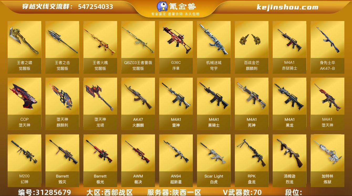 西部战区(陕西一区)ys【生化爆破号】70【M200-幻神套+皮/AG-CFPLS17冠军,堕天神套装,ScarLight-白虎+音效卡,QBZ03-王者蔷薇,AWM-裁决+皮/星际旅行,6烈龙+6盘龙+死亡之眼,COP-堕天神,Colt1911-大黄蜂,猫猫手套】5王者【QBZ03-王者蔷薇,王者火魄,王者之击,王者之啸】4角色【四防王者葵-貂蝉,迷迭香,乔伊教练,修道士,灵狐者-职业经理】4音效【M200-幻神音效卡,ScarLight-白虎音效卡,Barrett-毁灭音效卡,M4A1-黑骑士音效卡】17皮【幻神-AG-CFPLS17冠军,黑骑士-白马银枪,裁决-星际旅行,雷神-R.LGD-CFPLS18冠军,雷神-星空,毁灭-战神张飞,火麒麟-轻羽,M4A1-千变-孔明,火麒麟-CF STAR,天龙-CF STAR,修罗-CF STAR】挑战枪【火狱乱世-超越Max,机甲撕裂者III,封神放逐者III,KAC-圣炎切割者III,试炼破坏者III】vip4截图展示段位不代表实际段位 如赛季更新等不可抗拒因素发生变化、时限道具不保证所剩时间