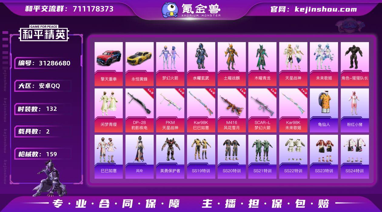 安卓手Q C-KWF261【8粉装6特效枪2载具2粉色飞行器 火箭/龟仙人/粉红小猪/水曜玄武/土曜战麒/木曜青龙/天星战神/未来歌姬/猩猩队长/闲梦青缨/风玲/莱茵河畔/萌趣绒叽】51811热力值-8王牌印记-132套装-159枪皮 【热门品类】:粉装-梦幻火箭,套装-龟仙人,套装-粉红小猪 【粉色套装】:粉装-水曜玄武,粉装-土曜战麒,粉装-木曜青龙,粉装-梦幻火箭,粉装-天星战神,粉装-未来歌姬,角色-猩猩队长,粉装-闲梦青缨 【粉色枪皮等级】:SCAR-L-梦幻火箭(四级),M416-风花雪月(四