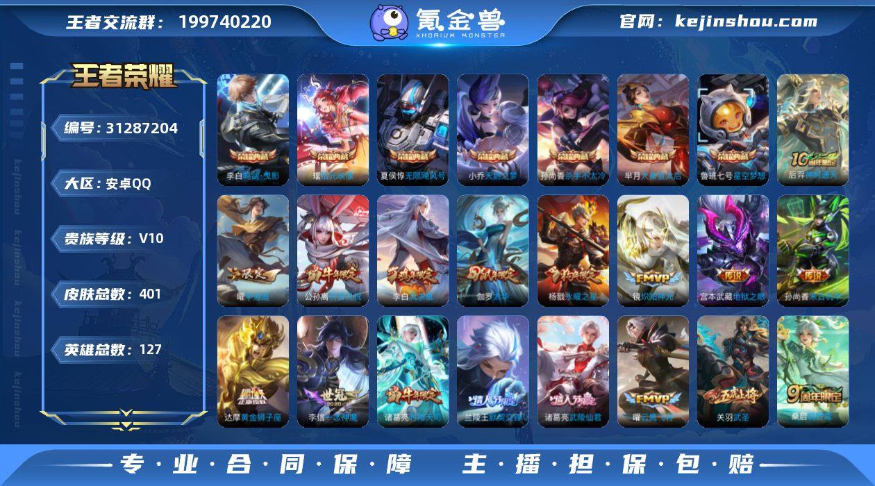 实名: 可修改 贵族等级: V10 英雄数: 127 皮肤数: 401 荣耀水晶: 武则天,天鹅之梦,星空梦想,无限飓风号,杀手不太冷,大秦宣太后,鸣剑·曳影,拾光映像 传说皮: 黄金狮子座,黄金射手座,冠军飞将,云鹰飞将,绛天战甲,黄金白羊座,猫影幻舞,久胜战神,炽阳神光,一念神魔,云霓雀翎,末日机甲-孙尚香,地狱火,仲夏夜之梦,零号·赤焰,海洋之心,地狱之眼,胖达荣荣,李逍遥,时之恋人-刘备,超时空战士-狄仁杰,艾琳觅芳踪,启明星使,神树通天 限定皮: 遇见飞天,李小龙,奔雷神使,祈雪灵祝,游园惊梦,梁祝,御风骁将,云端筑梦师,时雨天司,引擎之心,龙胆,武圣,烈魂,魔法小厨娘,辉光之辰,玄嵩,白晶晶,岱宗,虎魄,神威,永曜之星,幽恒,时之彼端,奇迹圣诞,飞衡,太华,天狼征服者,逐梦之音,冰霜恋舞曲,天狼运算者,逐梦之星,逐梦之影,天狼绘梦者,凤求凰,青龙志,瑞麟志,玄武志,凤凰于飞,如梦令-嫦娥,至尊宝,默契交锋-兰陵王,一生所爱,武陵仙君,如梦令-后羿,大圣娶亲,默契交锋-花木兰,霸王别姬-项羽,霸王别姬-虞姬,高山流水,猪悟能,鸣野蒿