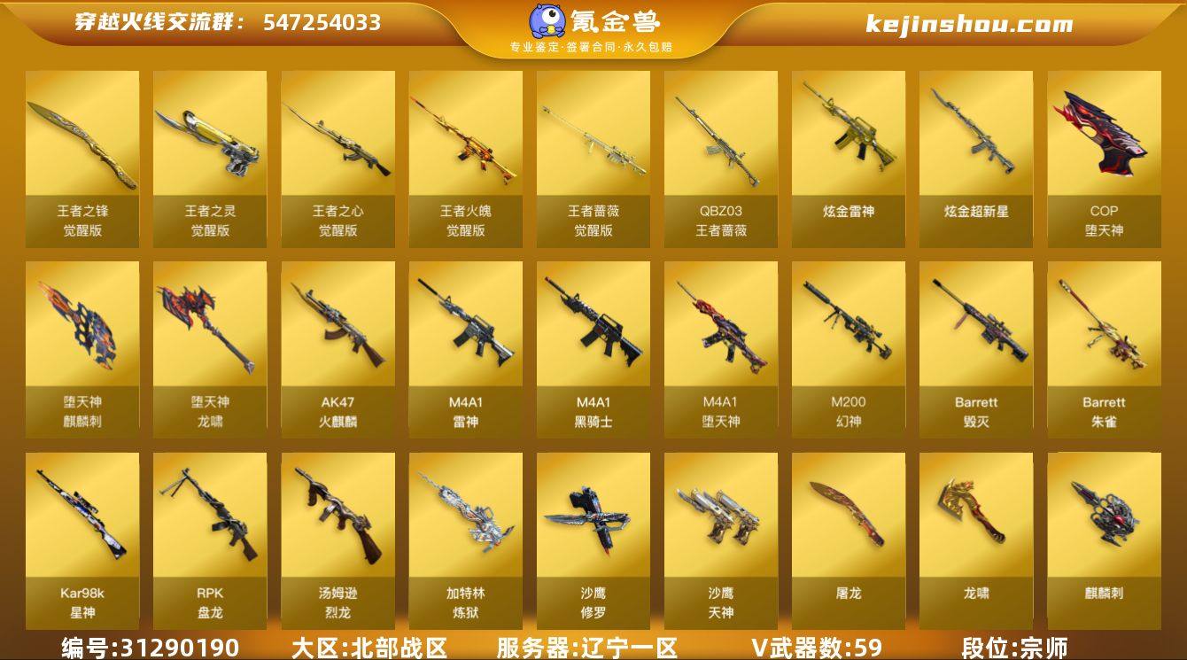 辽宁一区-76V-6王者武器数-2炫金武器数 【热门武器】:M200-幻神,QBZ-03-王者蔷薇,Kar98K-星神,毒蜂,M4A1-黑骑士,汤姆逊-烈龙*6,RPK-盘龙*2,加特林-炼狱*4,斯泰尔-蝴蝶,COP-堕天神*2,沙鹰-修罗*4,金刚伞 【王者炫金武器】:QBZ-03-王者蔷薇,炫金雷神,炫金超新星 【音效卡】:M4A1-黑骑士音效卡 【皮肤】:幻神-电竞之星 皮肤,火麒麟-雷神,火麒麟-平天大圣,毁灭-英雄计划 皮肤,战神-紫绶金章皮肤,AK47-B-常胜将军-曹操,AK47-B-常胜将军-刘备,擎天-秘银 【角色】:葵,樱,魅影,迷迭香,电竞教官-云悠悠,毒蝰术士,王者-瞳-闭月羞花,王者-魅影,王者雾萌萌,空,初恋灵狐,风暴女,零-水下丽影,灵狐者-职业经理,龙儿-小淘气,潘多拉-甜心教官,邱刚敖,斯沃特-X,甜心偶像,蜀雪 【人偶武器】:斯泰尔-蝴蝶,巴雷特-零-水下丽影,迷你生化手雷,生化手雷-机甲核心*2,闪光弹-小乔,闪光弹-貂蝉,高爆手雷-大乔,迷你艾比 【暴走生化】:毒蜂,异变清道夫,超级对讲机 【挑战大师】:冰龙粉碎者-白马银枪,激光毁灭者III,神圣爆裂者-末日III,阐释者III*2 【英雄级武器】:AK47-火麒麟*2,M4A1-雷神,M4A1-黑骑士,M4A1-堕天神,王者之心-觉醒版,AK-47-猩红传说,王者火魄-觉醒版,AK47-B-常胜将军,Barrett-毁灭,M200-幻神,Barrett-朱雀,Kar98K-星神,王者蔷薇-觉醒版,RPK-盘龙*2,加特林-炼狱*4,汤姆逊-烈龙*6,沙鹰-修罗*4,沙鹰-天神,COP-堕天神*2,王者之灵-觉醒版,屠龙,龙啸,麒麟刺-堕天神,擎天,麒麟刺,龙啸-堕天神,王者之锋-觉醒版,高爆手雷-堕天神*6,闪光弹-堕天神*6,烟雾弹-堕天神*6 【道具】:CFS限定背包,炫彩背包,超级背包,绿色巨人,灵魂忍者,变异宝贝,迷雾幽灵,夺命之镰,防化服*2,语音特效-机器人,C4-沙漠,防弹头盔*3,防弹衣*3,C4工具钳*2,手...