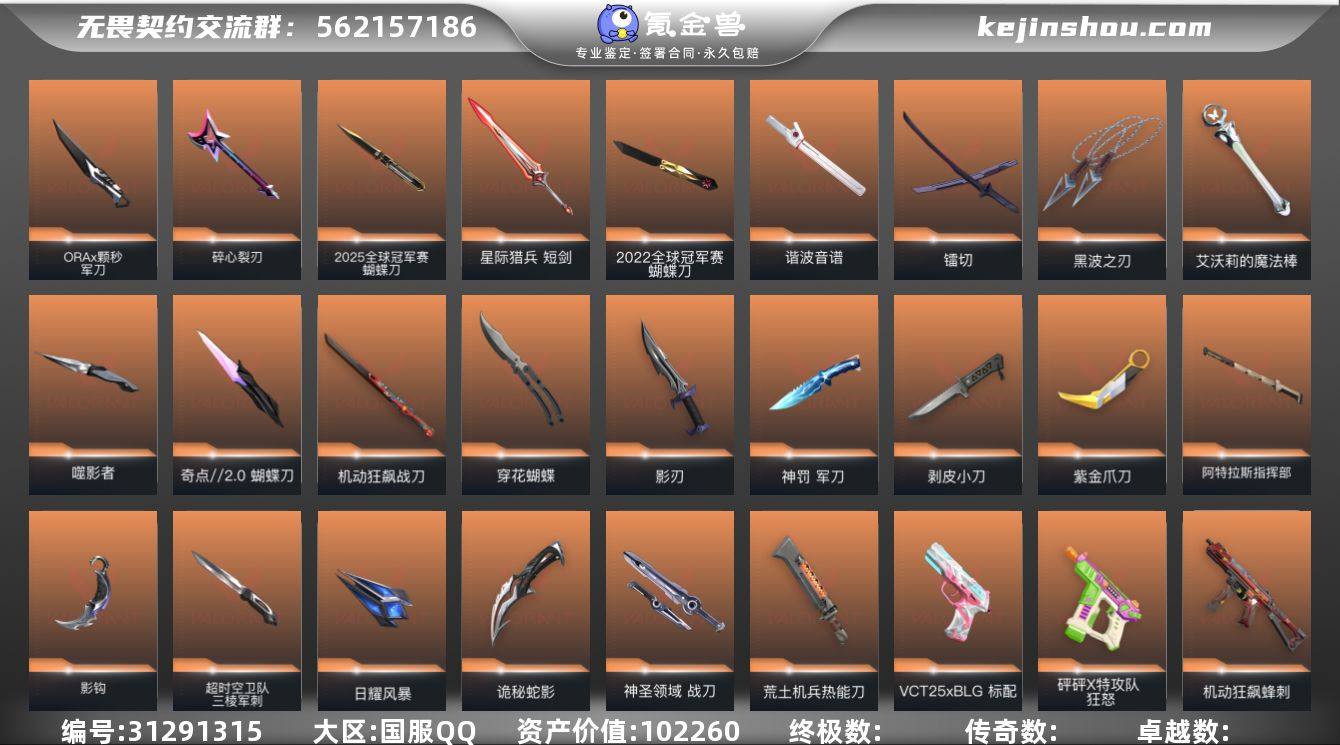 段位: 钻石 套装: VCTCN2025套装 近战武器皮肤: 军刀-弧光异彩,匕首-沙尘幻旅,剥皮小刀-异形猎人,短剑-流星兵团,VCT 2025 爪刀,诡秘蛇影 步枪皮肤: 狂徒-紫阙金琅,狂徒-盖亚的复仇,幻影-侦察力量,狂徒-归零者,幻影-盖亚的复仇2.0,狂徒-塑水宗,狂徒-混沌序曲,狂徒-超时空卫队 佩枪皮肤: 标配-紫阙金琅,正义-西部未来,鬼魅-超时空卫队 狙击枪皮肤: 冥驹-上古龙炎 霰弹枪皮肤: 判官-上古龙炎