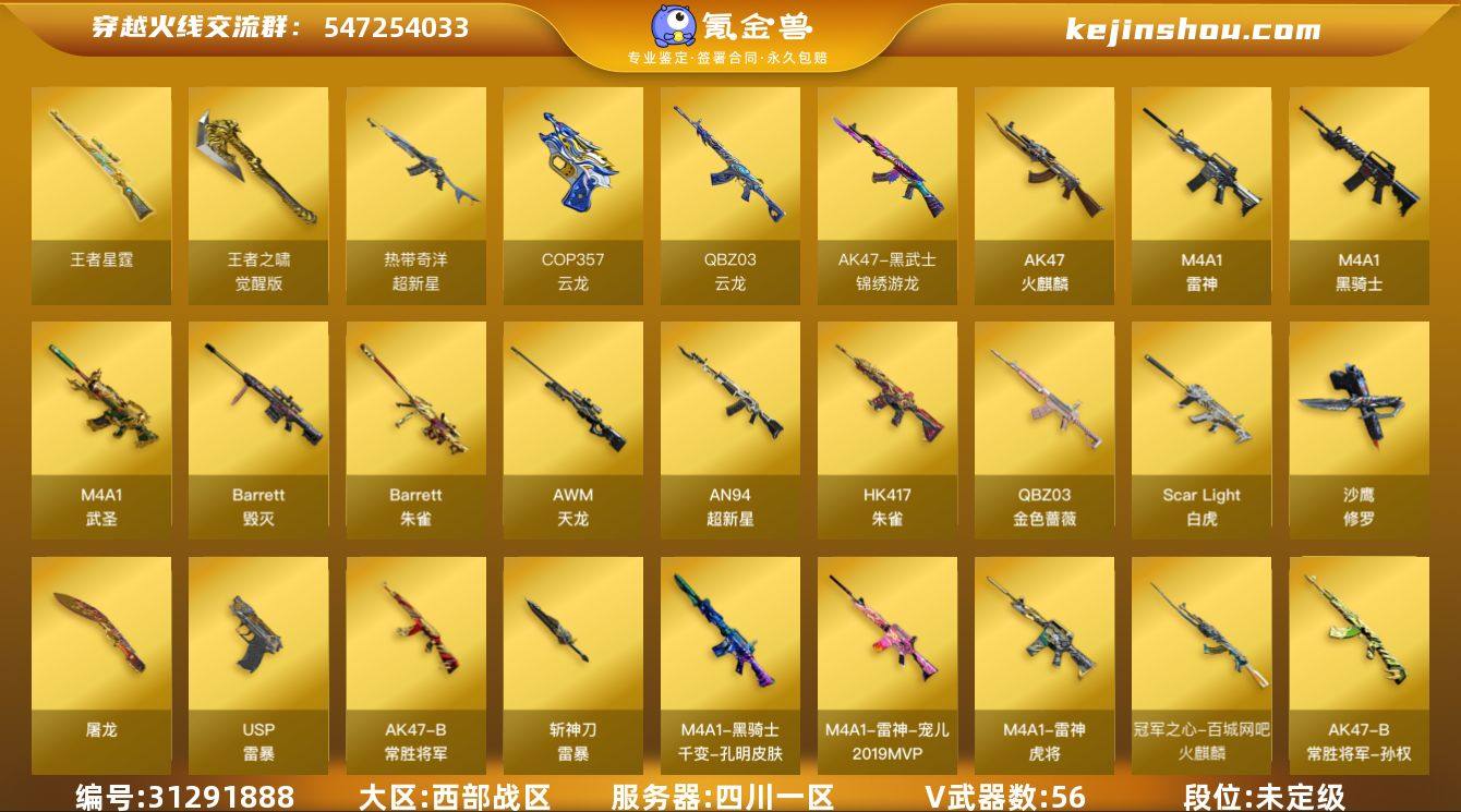 四川一区-61V-5王者武器数-1炫金武器数 【传说角色】:传说影煞 【热门武器】:QBZ03-金色蔷薇,Scar Light-白虎,HK417-朱雀,死亡之眼,M4A1-黑骑士,斯泰尔-蝴蝶,USP-雷暴,沙鹰-修罗*2 【王者炫金武器】:王者星霆,炫金骑士 【音效卡】:AN94-超新星-热带奇洋音效卡,HK417-朱雀音效卡 【皮肤】:ScarLight-白虎-冠军之虎皮肤,雷神-荣耀之魄,雷神-虎将,雷神-宠儿-2019MVP,雷神-神秘按键 皮肤,火麒麟-冠军之心,火麒麟-轻羽皮肤,火麒麟-平天大圣,火麒麟-心动糖果,毁灭-荣耀之怒,M4A1-千变-孔明皮肤,AK47-B-常胜将军-刘备*2,AK47-B-常胜将军-孙权,屠龙-荣耀之锋 【角色】:关小雨,战地猎狐,王者涂鸦,奇洋探员,暗夜-X,初恋灵狐,飞虎队-X,风暴女,嘉年华灵狐,娟娟,斯沃特-X,蜀雪,游珑儿 【人偶武器】:斯泰尔-蝴蝶,AWM-灵狐-15周年嘉年华,迷你裂空之翼,迷你曼提柯尔,迷你火种*2,深渊终结者手雷,闪光弹-貂蝉,高爆手雷-大乔,灵狐娃娃手雷 【暴走生化】:死亡之眼,超级对讲机 【挑战大师】:神圣爆裂者III*2,冰龙粉碎者-白马银枪*2,激光毁灭者III-白马银枪,试炼破坏者III,KAC-圣炎切割者III 【英雄级武器】:AK47-火麒麟,M4A1-雷神,M4A1-黑骑士,AN94-超新星,M4A1-武圣,HK417-朱雀,Scar Light-白虎,QBZ03-云龙*2,黑武士-锦绣游龙,超新星-热带奇洋,QBZ03-金色蔷薇,AK47-B-常胜将军,王者之烈-觉醒版,AWM-天龙,Barrett-毁灭,Barrett-朱雀,王者风神-觉醒版,沙鹰-修罗*2,USP-雷暴,COP 357-云龙,屠龙*2,龙啸-热带奇洋,斩神刀-雷暴,王者之锋-觉醒版,王者之啸-觉醒版,高爆手雷-雷暴*4,高爆手雷-云龙*3,手雷-热带奇洋,闪光弹-雷暴*4,闪光弹-云龙*4,烟雾弹-雷暴*5,烟雾弹-幻灵,烟雾弹-云龙*4,M4A1-赤狱骑士,M4A1-苍鸣雷神 【道具】