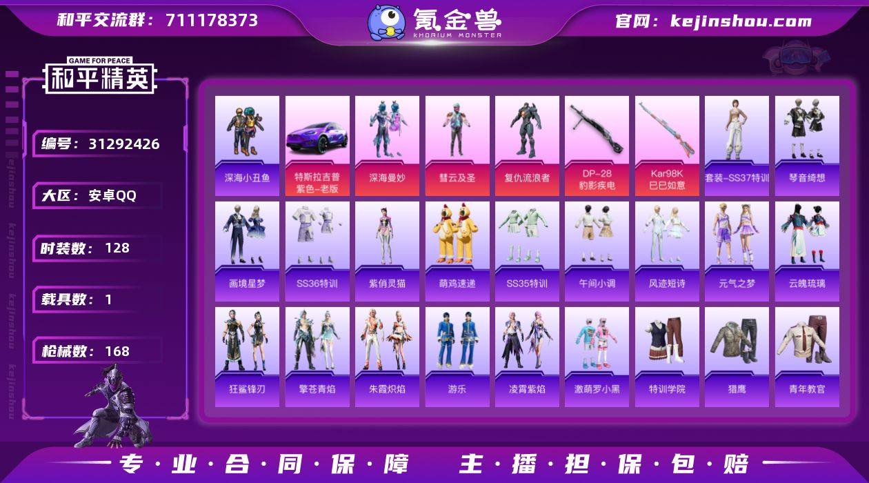 安卓 手Q-8粉装-3特效枪-0载具-2粉色飞行器-42504热力值-4王牌印记-96套装-134枪皮 【热门品类】:套装-深海小丑鱼,套装-龟仙人 【粉色套装】:粉装-冰霜白皇,粉装-炙焰红王,粉装-银龙傲海,粉装-彩虹鹿灵,角色-洛天依,粉装-冷魅冰骑,粉装-赤焰黑爵,粉装-紫电风暴 【粉色枪皮等级】:Kar98K-巳巳如意(五级),Mk14-甜梦熊击(五级),DP-28-豹影疾电(五级) 【粉色枪皮】:Kar98K-巳巳如意,Mk14-甜梦熊击,DP-28-豹影疾电 【粉色飞行器】:梦幻舞会飞行器 【粉色降落伞】:梦幻火箭降落伞,星之彼岸降落伞,烈焰拳霸降落伞,暗夜玫瑰降落伞,林间仙鹿降落伞,碧影闪光降落伞,冷魅冰骑降落伞,第五大道降落伞,梦幻舞会降落伞,冷漠罗丽降落伞,异瞳寒姬降落伞,炫彩糖果降落伞 【稀有套装】:套装-龟仙人,套装-粉恋花,套装-紫幽梦,套装-蓝冰羽,套装-极速光影,套装-云朵鹅,套装-雪绒豹,角色-乐音,套装-朱霞炽焰,套装-凌霄紫焰,角色-申公豹,角色-紫俏灵猫,套装-画境星梦,套装-琴音绮想 【稀有枪皮】:AKM-灼热熔岩,AKM-破晓战魂,AKM-虎虎生威,M16A4-夜灯,M16A4-幻世战舞者,M16A4-红色方程式,SCAR-L-炫彩节奏,SCAR-L-红色方程式,SCAR-L-冷漠罗丽,M416-紫翼圣骑,M416-红色方程式,M416-蓝色火焰,GROZA-异彩先驱,GROZA-懵萌河马,GROZA-林间仙鹿,AUG-耀粉歌者,QBZ-彩虹符号,QBZ-赛罗,QBZ-飞驰魅影,M762-瑞龙福将,M762-云朵鹅,G36C-懵萌河马,G36C-时空追击者,G36C-暗夜玫瑰,ACE32-画境星梦,ARX-凌霄紫焰,UZI-啾咪啾咪,UZI-炫彩节奏,UZI-红色方程式,UMP45-时空追击者,UMP45-涂山之恋,UMP45-生命誓言,UMP45-极意拳锋,Vector-彩虹符号,Vector-暗夜玫瑰,Vector-生命誓言,汤姆逊-天降萌叽,汤姆逊-异彩先驱,汤姆逊-炫彩节奏,汤姆逊-耀粉歌者,野牛-王牌四分卫,MP5K-...