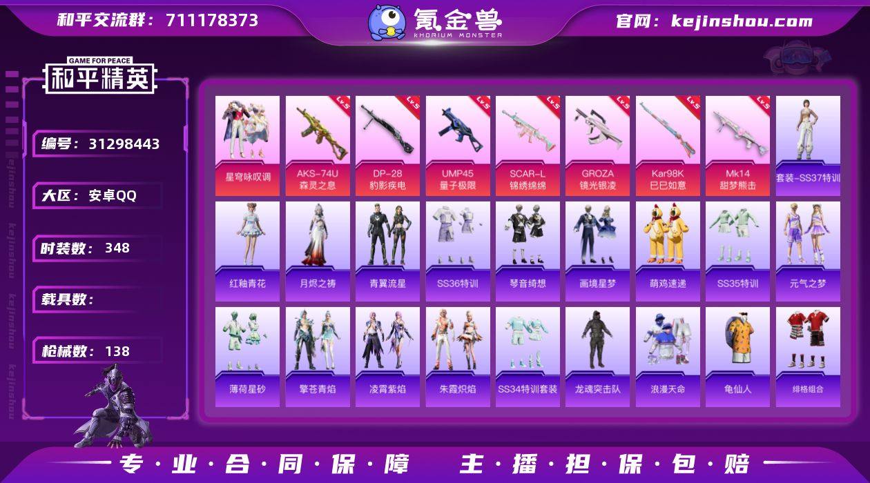 热力值:37295 时装数:348 枪械数:138 战备数:97 游戏等级:59 卓越印记:7 传奇印记:1 绝世印记:0 星穹咏叹调 五级AKS-74U-森灵之息,五级DP-28-豹影疾电,五级GROZA-镜光银凌,五级Kar98K-巳巳如意,五级MK14-甜梦熊击,五级SCAR-L-锦绣绵绵,五级UMP45-量子极限 夜幕颂歌飞行器,春暖花开降落伞,冷漠罗丽降落伞,千金淑猫降落伞 红釉青花,SS37特训,青翼流星,月烬之祷,画境星梦,琴音绮想,SS36特训,萌鸡速递,SS35特训,元气之梦,薄荷星砂,凌霄紫焰,擎苍青焰,SS34特训套装,朱霞炽焰,冰川特警,缤纷果语,冰河战士,白色伏地魔,春光漫游,彩虹兔,雏菊兔兔,长空猛禽,春日漫步,顶瓜瓜,蝶变,大橘大利,都市丽猫,绯格组合,粉恋花,粉日山川,龟仙人,海岛探路者,湖蓝色名流,黑色伏地魔,黄色伏地魔,黄色名流,幻世战舞者,红熊茄茄,惊鸿侠骨,竞技名士,街头风暴,锦衣飞扬,空岛之星,快闪甜心,蓝冰羽,蓝彩潮人,龙的传人,灵公主,龙魂突击队,猎鹰,玲珑飞花,萝兰蝴蝶,黎明保卫者,浪漫天命,恋语绒绒,猛禽,魅力单车,霓虹街区,柠萌假日,破蛋小黄鸡,云朵鹅,SS23特训,SS24特训,SS25特训,SS26特训,SS27特训,SS28特训,SS29特训,SS30特训套装,SS31特训套装,SS32特训套装,SS33特训套装,巳巳如意,甜蜜菠萝,豚鼠丹丹,特训学院,雪绒豹,旭日情侣,香桃花海,星途旅人,小熊娃娃,星渊小夜曲,鱼渊荷华,燕燕于飞,异域银装,智谋强哥,紫幽梦 AA12-G-雨过天青,AMR-雨过天青,PKM-雨过天青,沙漠之鹰-雨过天青,燃烧瓶-福马献瑞,ACE32-冰晶雪宝,PKM-啾咪啾咪,AA12-G-画境星梦,ACE32-画境星梦,M1加兰德-画境星梦,MK12-乌木金纹,MP5K-画境星梦,平底锅-画境星梦,Famas-霓彩脉冲,破片手榴弹-拽到爆炸,Mini14-鸡智如我,MG-36-薄荷星砂,P90-玩趣呆呆,AC-VAL-快闪甜心,AKM-龙的传人,AKS-74U-鬼刀,AKS-74U-鸡智如我,ARX-凌霄紫焰,AUG-天降萌叽,AUG-耀粉歌者,爆炸猎弓-惊鸿侠骨,DBS-彩虹符号,DBS-第五大道,DBS-圣堂之誓,大砍刀-云朵鹅,DP-28-彩虹符号,GROZA-海盐豹豹,GROZA-荧海星豚,JS9-凌霄紫焰,Kar98K-彩虹符号,M16A4-冰河战士,M200-惊鸿侠骨,M200-乌木金纹,M249-彩虹符号,M249-绯穹魔姬,M249-糯团青竹,M416-糯团青竹,M417-惊鸿侠骨,M417-玩趣呆呆,M417-祥瑞锦鲤,M762-雏菊兔兔,M762-云朵鹅,MG-36-凌霄紫焰,MG3-惊鸿侠骨,MG3-蓝晶绮麟,MG3-智耀战神,蜜獾-天降萌叽,Mini14-雏菊兔兔,Mini14-香桃花海,Mk14-冰河战士,Mk14-紫幽梦,MK20-H-星途旅人,MK20-H-快闪甜心,P90-快闪甜心,P90-巳巳如意,P92-凌霄紫焰,P92-紫幽梦,平底锅-雏菊兔兔,平底锅-惊鸿侠骨,平底锅-快闪甜心,平底锅-凌霄紫焰,平底锅-紫幽梦,PKM-紫幽梦,破片手榴弹-巳巳如意,破片手榴弹-星途旅人,QBZ-绒兔团圆,R1895-雏菊兔兔,S12K-玩趣呆呆,S12K-智耀战神,S1897-糯团青竹,S1897-紫幽梦,S686-巳巳如意,SCAR-L-红色方程式,SCAR-L-冷漠罗丽,SCAR-L-星途旅人,SKS-炫彩节奏,SLR-极冰使者,沙漠之鹰-快