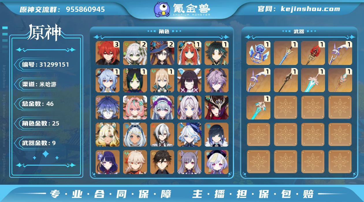冒险等级:60 总黄数:46 5星角色数:25 5星武器数:9 原石数量:178 纠缠之源数量:1 3命迪卢克,2命纳西妲,2命莫娜,1命妮露,1命魈,1命甘雨,1命提纳里,1命琴,0命哥伦比娅,0命杜林,0命菲林斯,0命瓦雷莎,0命梦见月瑞希,0命茜特菈莉,0命恰斯卡,0命希诺宁,0命玛拉妮,0命阿蕾奇诺,0命芙宁娜,0命夜兰,0命雷电将军,0命枫原万叶,0命钟离,0命刻晴,0命七七 6命班尼特,6命赛索斯,6命香菱,6命行秋,6命夏沃蕾,6命重云,6命迪奥娜,6命菲谢尔,6命雷泽,6命凝光,6命砂糖,6命云堇,5命卡齐娜,5命伊安珊,5命芭芭拉,5命卡维,5命坎蒂丝,5命托马,5命瑶瑶,4命嘉明,4命多莉,4命柯莱,4命罗莎莉亚,4命辛焱,4命烟绯,3命蓝砚,3命丽莎,3命诺艾尔,2命爱诺,2命久岐忍,2命欧洛伦,2命绮良良,2命塔利雅,2命北斗,2命鹿野院平藏,2命五郎,2命早柚,1命菲米尼,1命琳妮特,1命九条裟罗,1命凯亚,1命米卡,0命雅珂达,0命夏洛蒂,0命伊法,0命安柏,0命珐露珊 精1祭星者之望,精1苍古自由之誓,精1护摩之杖,精1阿莫斯之弓,精1贯虹之槊,精1天空之傲,精1天空之脊,精1天空之刃 100%侦察骑士,古恩希尔德的传承,极夜真梦,岁夜欢哗,纱中幽兰,星与月之约,致教会自由人