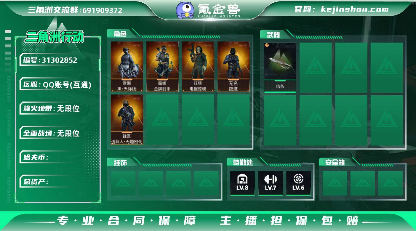 【特价出售】" 总资产118.55M,哈夫币 20715.68K,战场等级:17 列兵,行动等级:60 黄金,角色皮肤5,枪皮数量109【特战干员外观】蛊-能天使·午夜邮差,蜂医-送葬人·无题密令,红狼-电锯惊魂,露娜-金牌射手,深蓝-不破誓约,【近战】近战-信条,近战-电锯惊魂,近战-黑鹰,【典藏外观】AS Val突击步枪-悬赏令(优品B),G3战斗步枪-水墨迷彩,AUG突击步枪-常青藤,SKS射手步枪-蝴蝶,G3战斗步枪-凶兽,QCQ171冲锋枪-凶兽,【步枪】G3战斗步枪-骑士,SG552突击步枪-运动员,M16A4突击步枪-狩猎时刻,G3战斗步枪-狩猎时刻,腾龙突击步枪-捞点薯条,CAR-15突击步枪-阿米娅,M4A1突击步枪-阿米娅,M4A1突击步枪-蚀金玫瑰,ASh-12战斗步枪-鹅鸭杀,SCAR-H战斗步枪-启航,KC17突击步枪-电锯惊魂,腾龙突击步枪-无垢,AUG突击步枪-蝮蛇,K437突击步枪-守护者,AKM突击步枪-林中猎手,M16A4突击步枪-竞赛选手,SCAR-H战斗步枪-童趣,K416突击步枪-虎啸,SCAR-H战斗步枪-荣耀列队,腾龙突击步枪-雪崩,PTR-32突击步枪-天网,M7战斗步枪-前沿科技,M4A1突击步枪-海色,QBZ95-1突击步枪-海色,AKM突击步枪-彩墨喷涂,G3战斗步枪-山林猎人,M16A4突击步枪-山林猎人,PTR-32突击步枪-黄蜂,SG552突击步枪-彩墨喷涂,腾龙突击步枪-彩墨喷涂,QBZ95-1突击步枪-三角洲力量,SG552突击步枪-海浪,QBZ95-1突击步枪-海浪,SCAR-H战斗步枪-数码迷彩,M4A1突击步枪-粉色涂装,M7战斗步枪-红色涂装,AUG突击步枪-浅蓝涂装,SG552突击步枪-浅蓝涂装,K416突击步枪-几何迷彩,K416突击步枪-高雅黑,M4A1突击步枪-高雅黑,QBZ95-1突击步枪-高雅黑,G3战斗步枪-高雅黑,【狙击步枪/射手步枪】AWM狙击步枪-捞点薯条,M14射手步枪-电锯惊魂,SVD狙击步枪-荒野求生,PSG-1射手步枪-无垢,SV-98狙击步枪-林中猎手,SV-98狙击步枪-囚徒,M700狙击步...