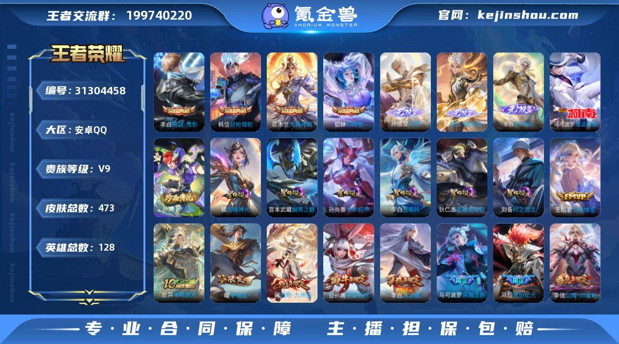 贵族等级:V9 典藏皮肤数:4 珍品无双皮肤数:0 无双皮肤数:3 珍品传说皮肤数:2 传说皮肤数:42 史诗皮肤数:148 皮肤数:473 英雄数:128 段位:至圣王者 卖家说:王者贵族九账号,查一两千贵族十,四百六十多个皮肤,最新的猴子无双也有,还有两千多星币,随便弄弄就够再换一个星传说,荣耀水晶三百左右幸运值了,再攒攒积分就够抽出来一个荣耀水晶了,可小刀。和平精英还有一个连体号,也充了一些钱,诚心出,急用钱。