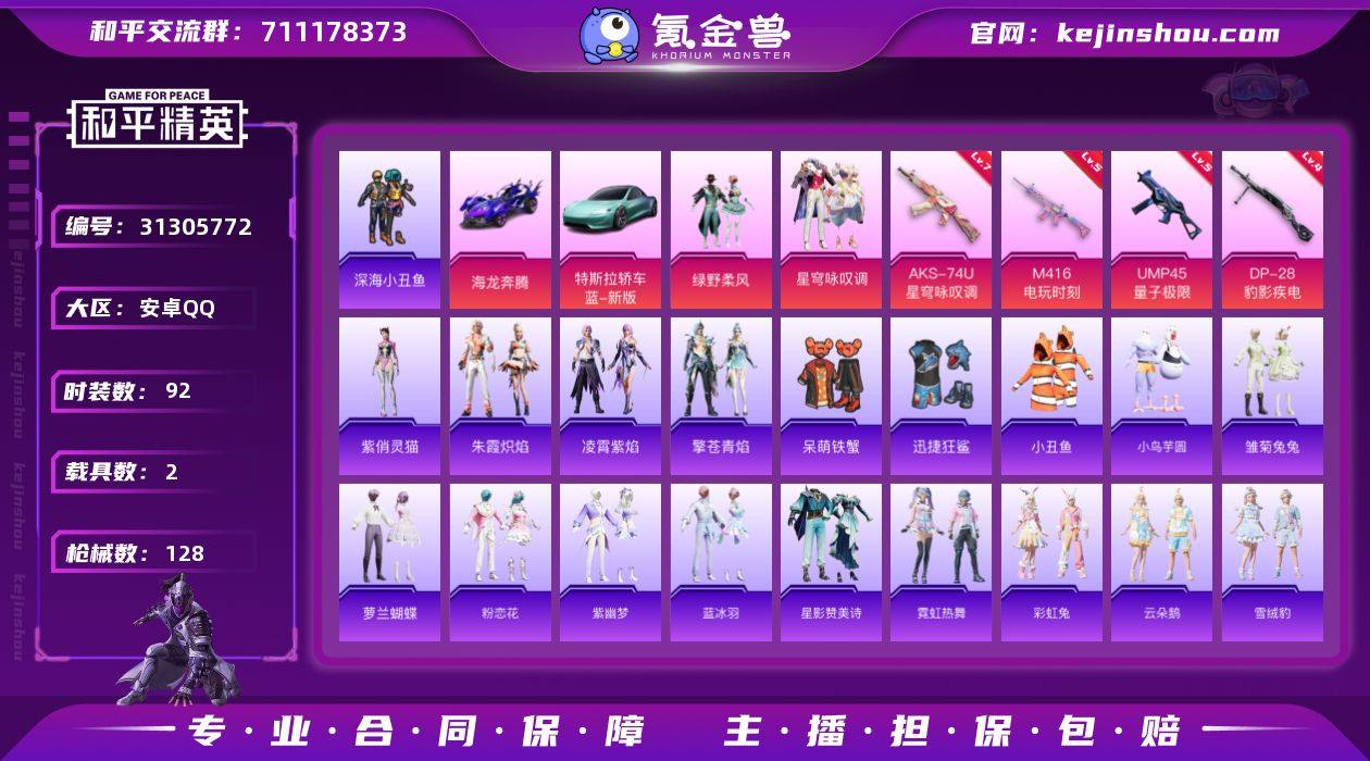 安卓手Q S-ZWM74【2粉装4特效枪2载具1粉色飞行器 深海小丑鱼/小丑鱼/绿野柔风/星穹咏叹调/小鸟芋圆/画境星梦/琴音绮想/呆萌铁蟹/迅捷狂鲨】44047热力值-2王牌印记-92套装-128枪皮 【热门品类】:套装-深海小丑鱼,套装-小丑鱼 【粉色套装】:粉装-绿野柔风,粉装-星穹咏叹调 【粉色枪皮等级】:M416-电玩时刻(五级),UMP45-量子极限(五级),AKS-74U-星穹咏叹调(七级),DP-28-豹影疾电(四级) 【粉色载具】:海龙奔腾,特斯拉Roadster(水滴蓝) 【粉色枪皮】