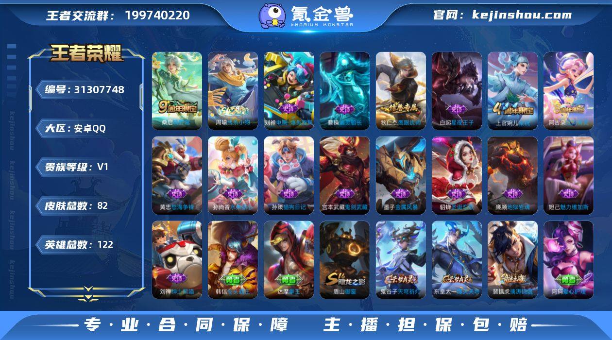 安卓Q-V0-尊贵铂金II段位-122英雄-82皮肤-1传说-15史诗 【传说皮肤】:桑启鸣野蒿 【限定皮肤】:狄仁杰阴阳师,高渐离玩趣恶龙,达摩沙漠行僧,李元芳云中旅人,沈梦溪大漠名商,明世隐疑决卦,裴擒虎擒涛扼浪,盾山御銮,上官婉儿梁祝,鲁班大师探海日志,桑启海盐诗旅,阿古朵江河有灵,张良古海寻踪,鬼谷子天穹祈灯,刘邦剑破天穹,程咬金群星魔术团,周瑜熔金海岸 【赛季限定】:盾山御銮,明世隐疑决卦,达摩沙漠行僧,沈梦溪大漠名商,李元芳云中旅人,桑启海盐诗旅,裴擒虎擒涛扼浪,鲁班大师探海日志,张良古海寻踪,鬼谷子天穹祈灯,刘邦剑破天穹,东皇太一噬灭天穹 【战令限定】:周瑜线条小狗 【史诗皮肤】:貂蝉圣诞恋歌,廉颇地狱岩魂,宫本武藏鬼剑武藏,孙尚香水果甜心,妲己魅力维加斯,墨子金属风暴,刘禅绅士熊喵,曹操幽灵船长,白起星夜王子,孙策猫狗日记,狄仁杰鹰眼统帅,上官婉儿梁祝,刘禅电玩爆裂旋风,阿古朵江河有灵,黄忠怒海争锋,周瑜线条小狗 【其他皮肤】:韩信教廷特使,韩信街头霸王,露娜哥特玫瑰,阿轲爱心护理,芈月红桃皇后,姜子牙时尚教父,妲己少女阿狸,典韦黄金武士,亚瑟死亡骑士,达摩拳王,花木兰兔女郎,甄姬花好人间,狄...