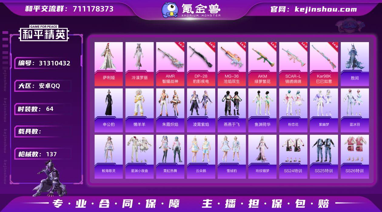 安卓 手Q-2粉装-6特效枪-0载具-1粉色飞行器-32545热力值-6王牌印记-64套装-137枪皮【粉色套装】:角色-萨利娅,角色-冷漠罗丽【粉色枪皮等级】:AKM-绿萝繁花(五级),SCAR-L-锦绣绵绵(五级),Kar98K-巳巳如意(五级),AMR-智耀战神(七级),DP-28-豹影疾电(五级),MG-36-沧焰双生(五级)【粉色枪皮】:AKM-绿萝繁花,SCAR-L-锦绣绵绵,Kar98K-巳巳如意,AMR-智耀战神,DP-28-豹影疾电,MG-36-沧焰双生【粉色飞行器】:极意拳锋飞行器【粉色降落伞】:齐天大圣降落伞,彩虹甜喵降落伞,繁龙极客降落伞,幻海仙踪降落伞,星穹咏叹调降落伞,幻彩电音降落伞,双重狂想降落伞,异瞳寒姬降落伞【稀有套装】:套装-燕燕于飞,套装-鱼渊荷华,套装-粉恋花,套装-紫幽梦,套装-蓝冰羽,角色-鲛海歌灵,套装-星渊小夜曲,套装-霓虹热舞,套装-云朵鹅,套装-雪绒豹,角色-玫纹锢梦,套装-朱霞炽焰,套装-凌霄紫焰,玩偶服-懒羊羊,角色-敖闰,角色-申公豹【稀有枪皮】:AKM-彩虹符号,AKM-龙的传人,M16A4-幻世战舞者,SCAR-L-夜灯,SCAR-L-红色方程式,SCAR-L-黄金龙骨,M416-糯团青竹,M416-绯红前夜,M416-蓝色火焰,GROZA-懵萌河马,GROZA-荧海星豚,AUG-天降萌叽,AUG-耀粉歌者,AUG-绝对恒星,M762-彩虹符号,M762-绯红前夜,M762-云朵鹅,G36C-懵萌河马,G36C-星穹咏叹调,AC-VAL-天降萌叽,AC-VAL-快闪甜心,ARX-凌霄紫焰,UZI-啾咪啾咪,UZI-红色方程式,UMP45-夜灯,UMP45-涂山之恋,UMP45-生命誓言,汤姆逊-天降萌叽,汤姆逊-梦之光华,汤姆逊-耀粉歌者,汤姆逊-智耀战神,MP5K-飒粉甜心,AKS-74U-鬼刀,JS9-凌霄紫焰,P90-快闪甜心,M24-幻彩电音,SKS-炫彩节奏,VSS-彩虹符号,Mini14-耀粉歌者,Mk47-幻海仙踪,SLR-圣穹绘梦,莫辛纳甘-懵萌河马,M417-惊鸿侠骨,MK20-H-快闪甜心,MK20-H-樱桃泡泡,M200-惊鸿侠骨...