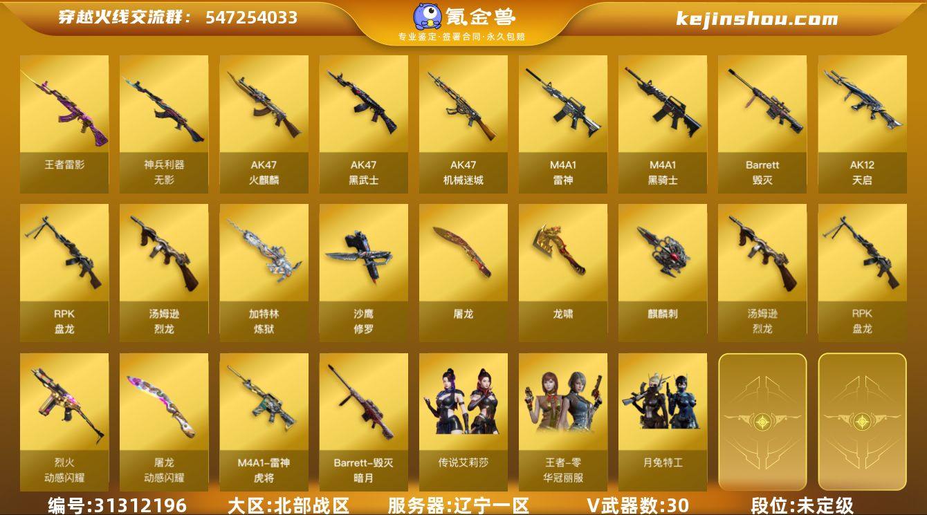 辽宁一区-32V-6王者-0炫金 【传说角色】:传说艾莉莎 【热门武器】:修罗-古蛇迷踪,炼狱-迷你小钢,M4A1-黑骑士,汤姆逊-烈龙*6,RPK-盘龙*6,加特林-炼狱,斯泰尔-蝴蝶,沙鹰-修罗*2,金刚伞 【王者炫金武器】:王者青龙,王者雷影 【皮肤】:雷神-虎将,雷神-源计划2.0专属 皮肤,火麒麟-心动糖果,毁灭-暗月,炼狱-星空 【角色】:月兔特工,战地猎狐,王者零-华冠丽服,蛇隐宗,乔伊教练,修道士,北极狐-X,风暴女,嘉年华灵狐,卡塔琳娜,兰-新年限定,灵狐者-X,麻雀,曼陀罗-X,潜龙队-X,青霞仙子,蛇姬,斯沃特-X,影武者-X 【人偶武器】:炼狱-迷你小钢,斯泰尔-蝴蝶,AWM-灵狐-15周年嘉年华,迷你深渊冰龙,迷你波特博士,夺魂,迷你生化手雷*2,生化手雷-机甲核心*4,深渊终结者手雷,迷你艾比,迷你超能女侍,迷你巨石泰坦-魔花研究所 【暴走生化】:异变清道夫,KAC-狂怒咆哮,双面神,超级对讲机 【挑战大师】:冰龙粉碎者-白马银枪,神圣爆裂者-末日III 【英雄级武器】:AK47-火麒麟,M4A1-雷神,M4A1-黑骑士,AK47-黑武士,AK12-天启,AK47-机械迷城,无影-神兵利器,烈火-动感闪耀,王者之势-觉醒版,QBZ-03-王者蔷薇-觉醒版,白虎之魄-觉醒版,Barrett-毁灭,王者凰鸣-觉醒版,RPK-盘龙*6,加特林-炼狱,汤姆逊-烈龙*6,沙鹰-修罗*2,天神-动感闪耀,修罗-古蛇迷踪,屠龙,龙啸,麒麟刺,屠龙-动感闪耀,手雷-动感闪耀,高爆手雷-古蛇迷踪,烟雾弹-古蛇迷踪,M4A1-赤狱骑士 【道具】:CFS限定背包,古蛇迷踪炫彩背包,背包-洛丽塔,超级背包,女皇终结者-魔龙之吻,救世主-黑桃战神,绿色巨人,变异宝贝,生化弹匣,夺命之镰,防化服*2,金色流光-枪王排位*2,星辰流光-枪王排位,流光-鎏金之域,流光-再燃火线,枪王排位28赛季金色流光,枪王排位29赛季金色流光,古蛇迷踪打击特效,蛇隐宗...