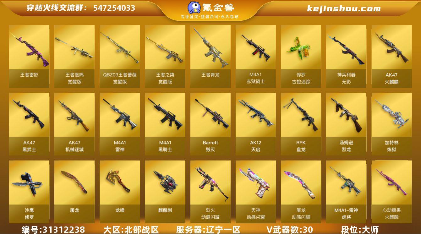 辽宁一区-32V-6王者-0炫金 【传说角色】:传说艾莉莎 【热门武器】:修罗-古蛇迷踪,炼狱-迷你小钢,M4A1-黑骑士,汤姆逊-烈龙*6,RPK-盘龙*6,加特林-炼狱,斯泰尔-蝴蝶,沙鹰-修罗*2,金刚伞 【王者炫金武器】:王者青龙,王者雷影 【皮肤】:雷神-虎将,雷神-源计划2.0专属 皮肤,火麒麟-心动糖果,毁灭-暗月,炼狱-星空 【角色】:月兔特工,战地猎狐,王者零-华冠丽服,蛇隐宗,乔伊教练,修道士,北极狐-X,风暴女,嘉年华灵狐,卡塔琳娜,兰-新年限定,灵狐者-X,麻雀,曼陀罗-X,潜龙队-X,青霞仙子,蛇姬,斯沃特-X,影武者-X 【人偶武器】:炼狱-迷你小钢,斯泰尔-蝴蝶,AWM-灵狐-15周年嘉年华,迷你深渊冰龙,迷你波特博士,夺魂,迷你生化手雷*2,生化手雷-机甲核心*4,深渊终结者手雷,迷你艾比,迷你超能女侍,迷你巨石泰坦-魔花研究所 【暴走生化】:异变清道夫,KAC-狂怒咆哮,双面神,超级对讲机 【挑战大师】:冰龙粉碎者-白马银枪,神圣爆裂者-末日III 【英雄级武器】:AK47-火麒麟,M4A1-雷神,M4A1-黑骑士,AK47-黑武士,AK12-天启,AK47-机械迷城,无影-神兵利器,烈火-动感闪耀,王者之势-觉醒版,QBZ-03-王者蔷薇-觉醒版,白虎之魄-觉醒版,Barrett-毁灭,王者凰鸣-觉醒版,RPK-盘龙*6,加特林-炼狱,汤姆逊-烈龙*6,沙鹰-修罗*2,天神-动感闪耀,修罗-古蛇迷踪,屠龙,龙啸,麒麟刺,屠龙-动感闪耀,手雷-动感闪耀,高爆手雷-古蛇迷踪,烟雾弹-古蛇迷踪,M4A1-赤狱骑士 【道具】:CFS限定背包,古蛇迷踪炫彩背包,背包-洛丽塔,超级背包,女皇终结者-魔龙之吻,救世主-黑桃战神,绿色巨人,变异宝贝,生化弹匣,夺命之镰,防化服*2,金色流光-枪王排位*2,星辰流光-枪王排位,流光-鎏金之域,流光-再燃火线,枪王排位28赛季金色流光,枪王排位29赛季金色流光,古蛇迷踪打击特效,蛇隐宗...