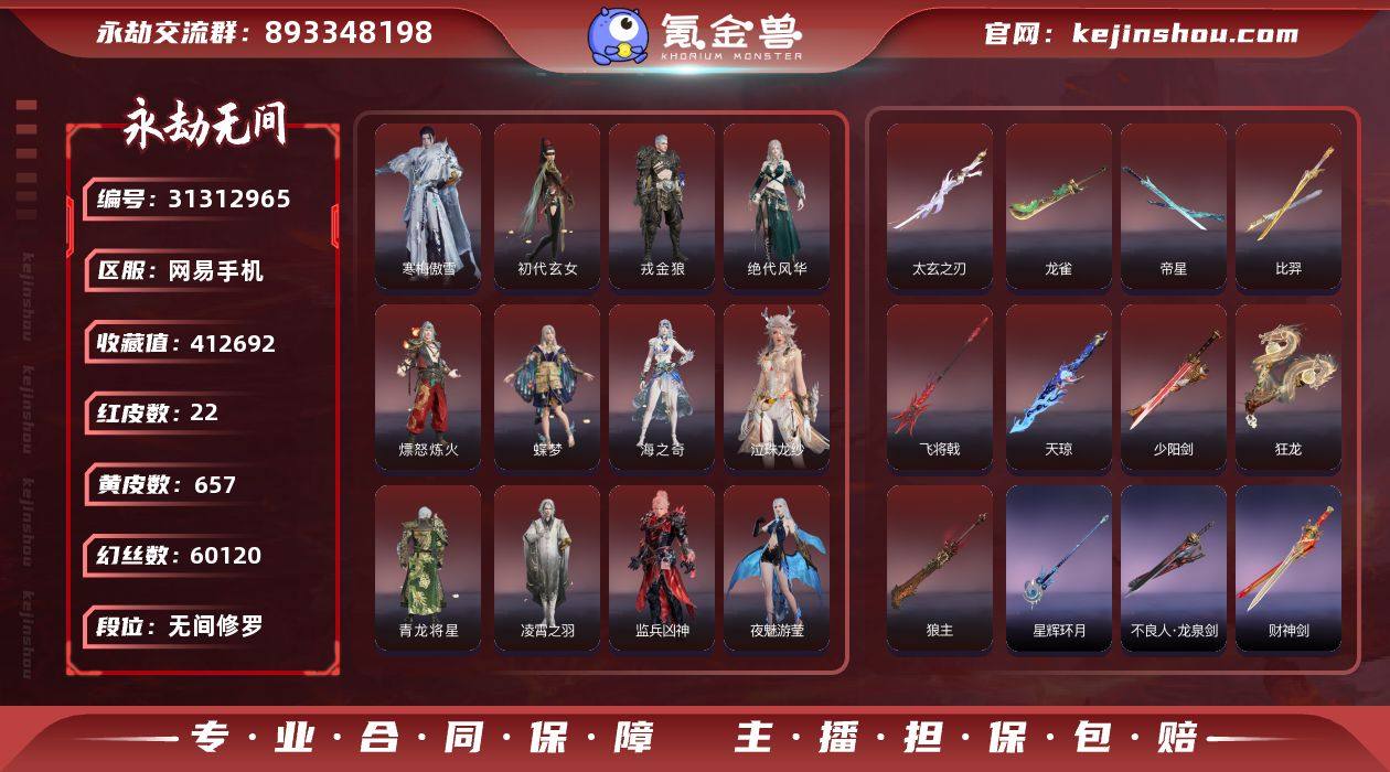 红皮数:22 黄皮数:657 收藏值:412692 幻丝数:60120 等级:554 三排段位:蚀月 通行证:已升级 寒梅傲雪,初代玄女,戎金狼,绝代风华,熛怒炼火,蝶梦,海之奇,泣珠龙纱,青龙将星,凌霄之羽,监兵凶神,夜魅游莹,流金晓锦 太玄之刃,龙雀,帝星,比羿,飞将戟,天琼,少阳剑,狂龙,狼主