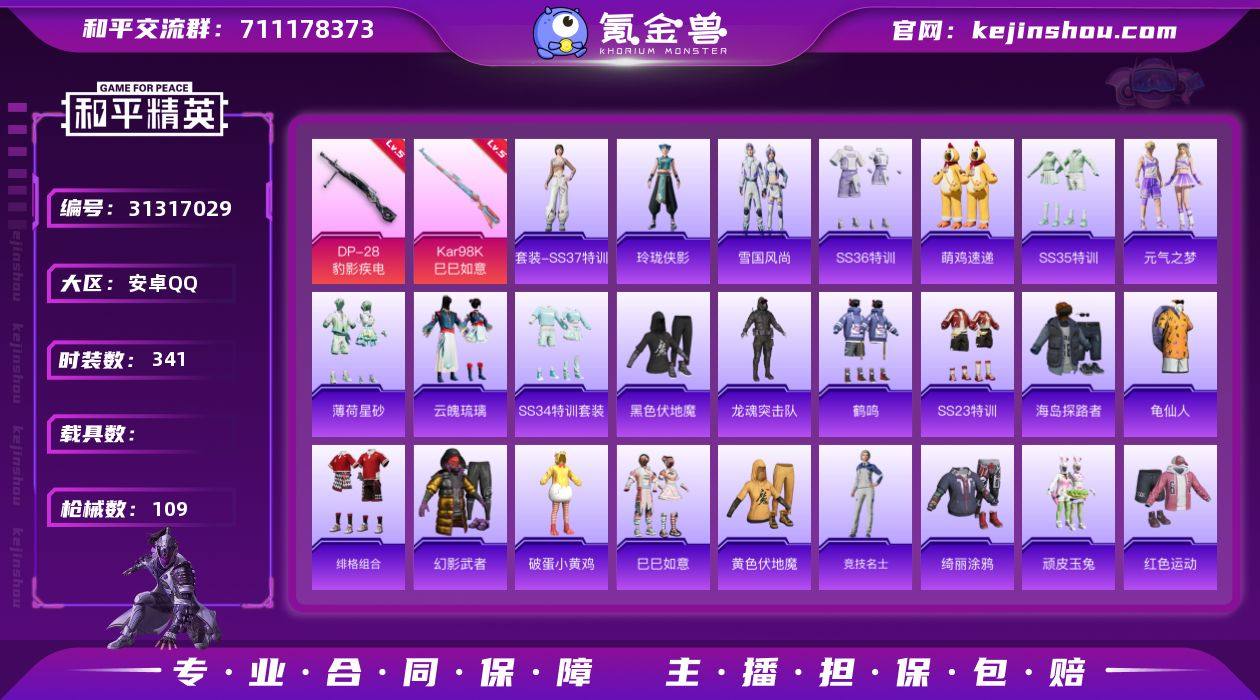 热力值:27308 时装数:341 枪械数:109 战备数:79 游戏等级:55 卓越印记:0 传奇印记:0 绝世印记:0 五级DP-28-豹影疾电,五级Kar98K-巳巳如意 极意拳锋降落伞,极意拳锋飞行器,炫彩糖果降落伞,炫彩糖果飞行器,脆鲨七海飞行器,鬼刀降落伞 SS37特训,玲珑侠影,雪国风尚,SS36特训,炫彩糖果,萌鸡速递,SS35特训,元气之梦,薄荷星砂,云魄琉璃,SS34特训套装,缤纷果语,滨海厨神,冰河战士,白糯汤圆,白色伏地魔,长空猛禽,创世·幻影,蝶变,都市魅力,电音精灵,风暴特警,绯格组合,龟仙人,光之冒险,海岛探路者,鹤鸣,黑色伏地魔,黄色伏地魔,黄色名流,黄色运动,红色运动,幻世战舞者,幻影武者,橘黑制服,竞技达人朋克,竞技名士,街头风暴,蓝彩潮人,龙的传人,龙魂突击队,猎鹰,蓝色运动,恋语绒绒,冷焰舞者,猛禽,魅力单车,霓虹街区,柠萌假日,破蛋小黄鸡,破晓战魂,青春校园,绮丽涂鸦,青年教官,热血青春,SS22特训,SS23特训,SS24特训,SS25特训,SS26特训,SS28特训,SS29特训,SS30特训套装,SS31特训套装,SS32特训套装,巳巳如意,天籁歌者,特训学院,完美偶像,顽皮玉兔,旭日情侣,夏日倾情,香桃花海,星途旅人,鱼渊荷华,燕燕于飞,异域银装,智谋强哥 燃烧瓶-福马献瑞,ACE32-冰晶雪宝,PKM-啾咪啾咪,MK12-乌木金纹,AUG-冰晶雪宝,铝热弹-炫彩糖果,UZI-炫彩糖果,撬棍-冰晶雪宝,AKM-霓彩脉冲,Famas-霓彩脉冲,Mk14-紫晶流影,SLR-霓彩脉冲,SVD-霓彩脉冲,信号枪-异瞳寒姬,破片手榴弹-拽到爆炸,S12K-霓彩脉冲,SCAR-L-彩虹符号,AKM-涂鸦街区,AUG-紫晶流影,Mini14-鸡智如我,AMR-喜羊羊与灰太狼,爆炸猎弓-喜羊羊与灰太狼,电击枪-喜羊羊与灰太狼,M249-冰晶雪宝,MG-36-薄荷星砂,P90-玩趣呆呆,AKM-彩虹符号,AKM-龙的传人,AKM-破晓战魂,AKS-74U-鬼刀,AKS-74U-鸡智如我,AUG-天降萌叽,AUG-耀粉歌者,AWM-飒粉甜心,DBS-彩虹符号,大砍刀-鬼刀,Famas-突变脉冲,GROZA-海盐豹豹,Kar98K-彩虹符号,Kar98K-红色方程式,Kar98K-洛神天依,M16A4-冰河战士,M16A4-幻世战舞者,M200-乌木金纹,M249-糯团青竹,M249-破晓战魂,M416-红色方程式,M416-糯团青竹,M762-第五大道,M762-天降萌叽,MG3-幻世战舞者,蜜獾-精灵梦叶罗丽,蜜獾-天降萌叽,Mini14-香桃花海,Mk14-冰河战士,MK20-H-狂鲨锋刃,Mk47-洛神天依,P90-巳巳如意,破片手榴弹-巳巳如意,破片手榴弹-星途旅人,S12K-破晓战魂,S12K-玩趣呆呆,S12K-夜灯,S686-红色方程式,S686-巳巳如意,SCAR-L-炫彩节奏,SCAR-L-夜灯,SKS-糯团青竹,SPAS-12-狂鲨锋刃,SPAS-12-燕燕于飞,十字弩-燕燕于飞,汤姆逊-炫彩节奏,UMP45-生命誓言,UMP45-涂山之恋,UMP45-夜灯,UZI-冰河战士,UZI-天降萌叽,Vector-彩虹符号,Vector-燕燕于飞,VSS-香桃花海,蝎式手枪-燕燕于飞,野牛-燕燕于飞 福马献瑞降落伞,马上有福飞行器,顶峰精英尾迹,空岛之星尾迹,异域银装飞行器,百战成名降落伞,鸡智如我飞行器,狂鲨锋刃飞行器,和平使命降落伞,镭金极速降落伞,星途旅人降落伞,燕燕于飞降落伞 实名:不可二次实名