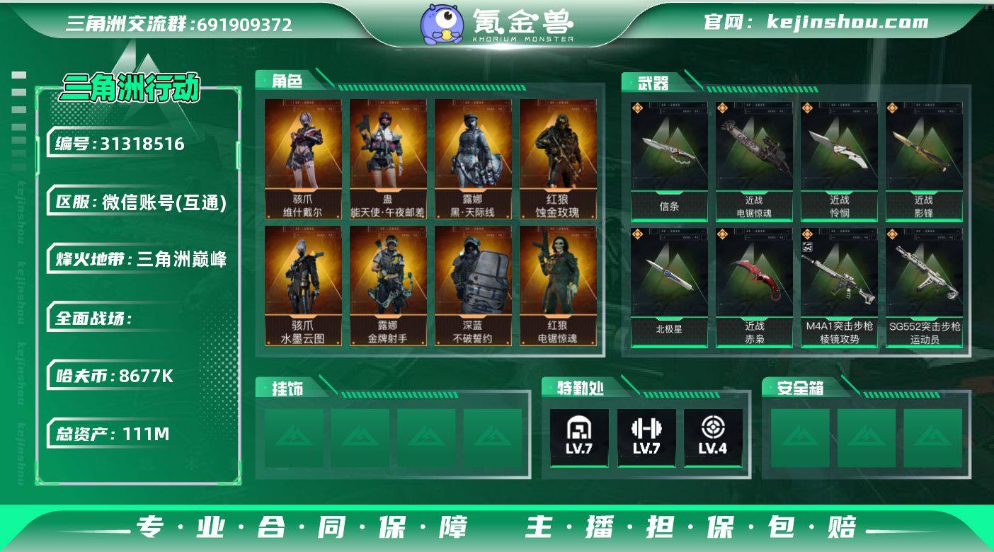 "HT-【S7赛季3X3/蚀金玫瑰/黑天际线/水墨云图/维什戴尔/午夜邮差/北极星/怜悯/影锋/信条/赤枭/电锯/龙牙/棱镜攻势M4A1优品C纯黑/毁灭之源隐藏挂饰/黑夜猎手隐藏挂饰】【总资产111m/流动资产85m/哈夫币860w/等级60级/部门23212】 特勤:仓库7指中5训中7靶场4 仓库:收藏室24m/三角券2000/非洲之心/AW子弹6发 亮点:天才少年 烽火段位:巅峰"