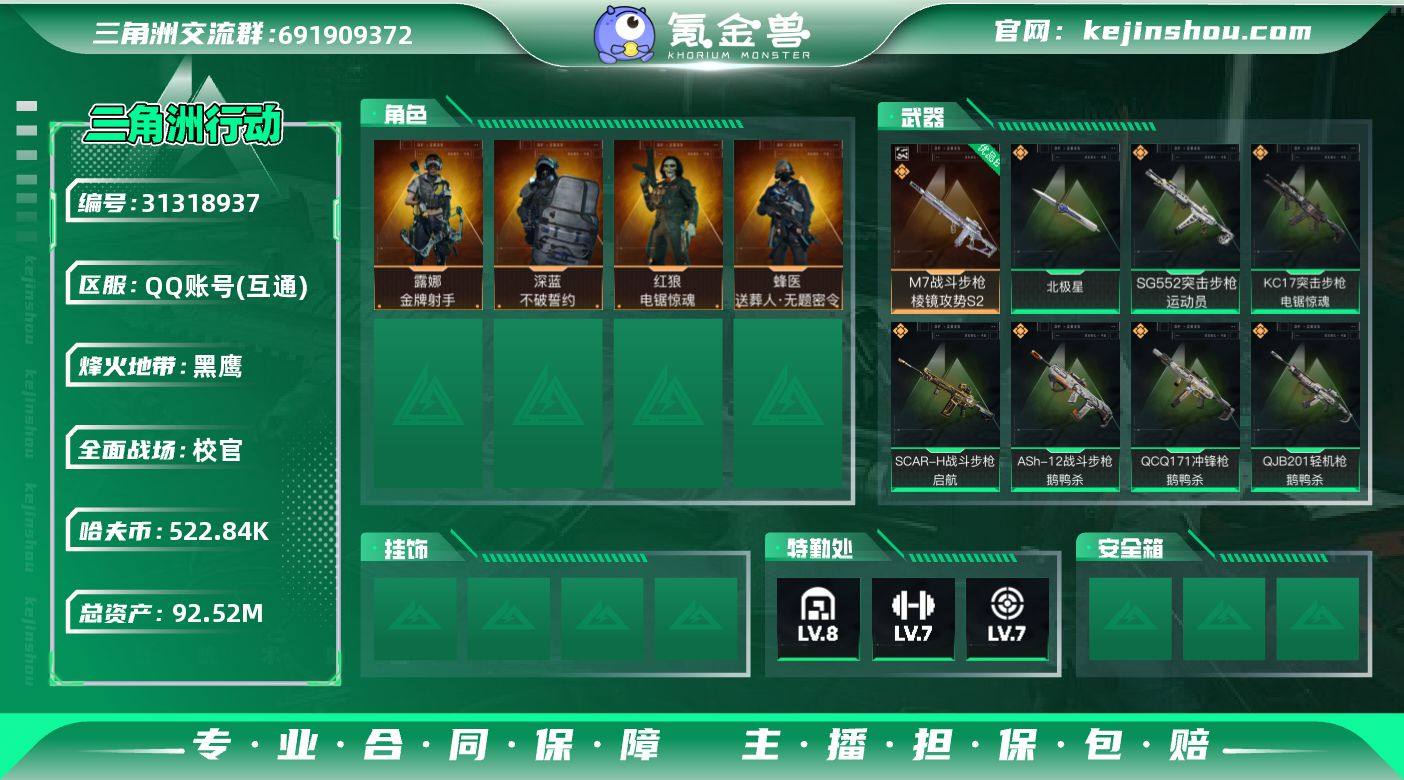 实名: 不可修改 烽火地带段位: 黑鹰 全面战场段位: 校官 总资产: 92521850 哈夫币: 522844 干员外观: 蜂医-送葬人·无题密令(S5),深蓝-不破誓约(S6),红狼-电锯惊魂,露娜-金牌射手(S7) 传说武器皮肤: 近战-北极星,K437突击步枪-北极星,QCQ171冲锋枪-北极星,725双管霰弹枪-送葬人-无题密令,M4A1突击步枪-阿米娅,CAR-15突击步枪-阿米娅,AWM狙击步枪-捞点薯条,腾龙突击步枪-捞点薯条,93R-捞点薯条,AK-12突击步枪-特斯拉线圈,SR-3M紧凑突击步枪-特斯拉线圈,UZI冲锋枪-特斯拉线圈,勇士冲锋枪-能天使-午夜邮差,SCAR-H战斗步枪-启航,ASh-12战斗步枪-鹅鸭杀,QCQ171冲锋枪-鹅鸭杀,QJB201轻机枪-鹅鸭杀,KC17突击步枪-电锯惊魂,SG552突击步枪-运动员 史诗武器皮肤: M700狙击步枪-竞技风,SVD狙击步枪-阿萨拉工艺,QBZ95-1突击步枪-曙光,S12K霰弹枪-曙光,沙漠之鹰-曙光,AUG突击步枪-蝮蛇,M700狙击步枪-蝮蛇,PKM通用机枪-蝮蛇,SG552突击步枪-深海恐惧,勇士冲锋枪-深海恐惧,MP5冲锋枪-深海恐惧,SV-98狙击步枪-林中猎手,M250通用机枪-囚徒,SV-98狙击步枪-囚徒,SCAR-H战斗步枪-囚徒,腾龙突击步枪-无垢,MP7冲锋枪-无垢,PSG-1射手步枪-无垢,SVD狙击步枪-荒野求生,SR-3M紧凑突击步枪-荒野求生,PKM通用机枪-荒野求生,M16A4突击步枪-竞赛选手,QJB201轻机枪-Old Habits,P90冲锋枪-紧急戒备,AWM狙击步枪-无极限,ASh-12战斗步枪-无极限,Mini-14射手步枪-守护者,K437突击步枪-守护者,复合弓-守护者,MP7冲锋枪-守护者,腾龙突击步枪-猎鳄行动,Vector冲锋枪-猎鳄行动,勇士冲锋枪-工业狂潮,SR-3M紧凑突击步枪-战术竞备,MP5冲锋枪-战术竞备,G3战斗步枪-流沙送葬,AWM狙击步枪-流沙送葬,AS Val突击步枪-百步穿杨,M700狙击步枪-百步穿杨,Vector冲锋枪-百步穿杨,M7战斗步枪-百步穿杨,Vector冲锋枪-异域战争,M700狙击步枪-哈夫克警备,SG552突击步枪-哈夫克...