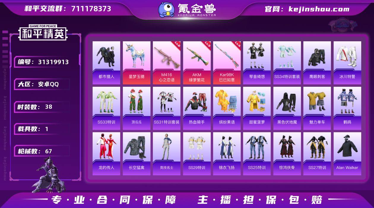 "H6723和平王者一体号 无二次 安卓Q-段位黄金 45级 2印记 38套装67枪皮 【1载具】 星梦玉骢 【3特效枪】 M416-心之恋雨 6级 AKM-绿萝繁华 5级 Kar98K巳巳如意 4级 【1飞行器】 齐天大圣飞行器 【热门】 都市猎人 Alan Walker 角色-极地流光 角色-粉雾星云 角色-银尘 鹤鸣 蓝冰羽 玩偶服-超人强 锦衣飞扬 弄潮海豚 【王者】 V6-41英雄30皮肤 【1无双】 群星魔术团 【1传说】 无双飞将 【史诗】 鸭鸭历险记 天秀·启明 辉光之辰 乱世虎臣 末日机甲 魔术师